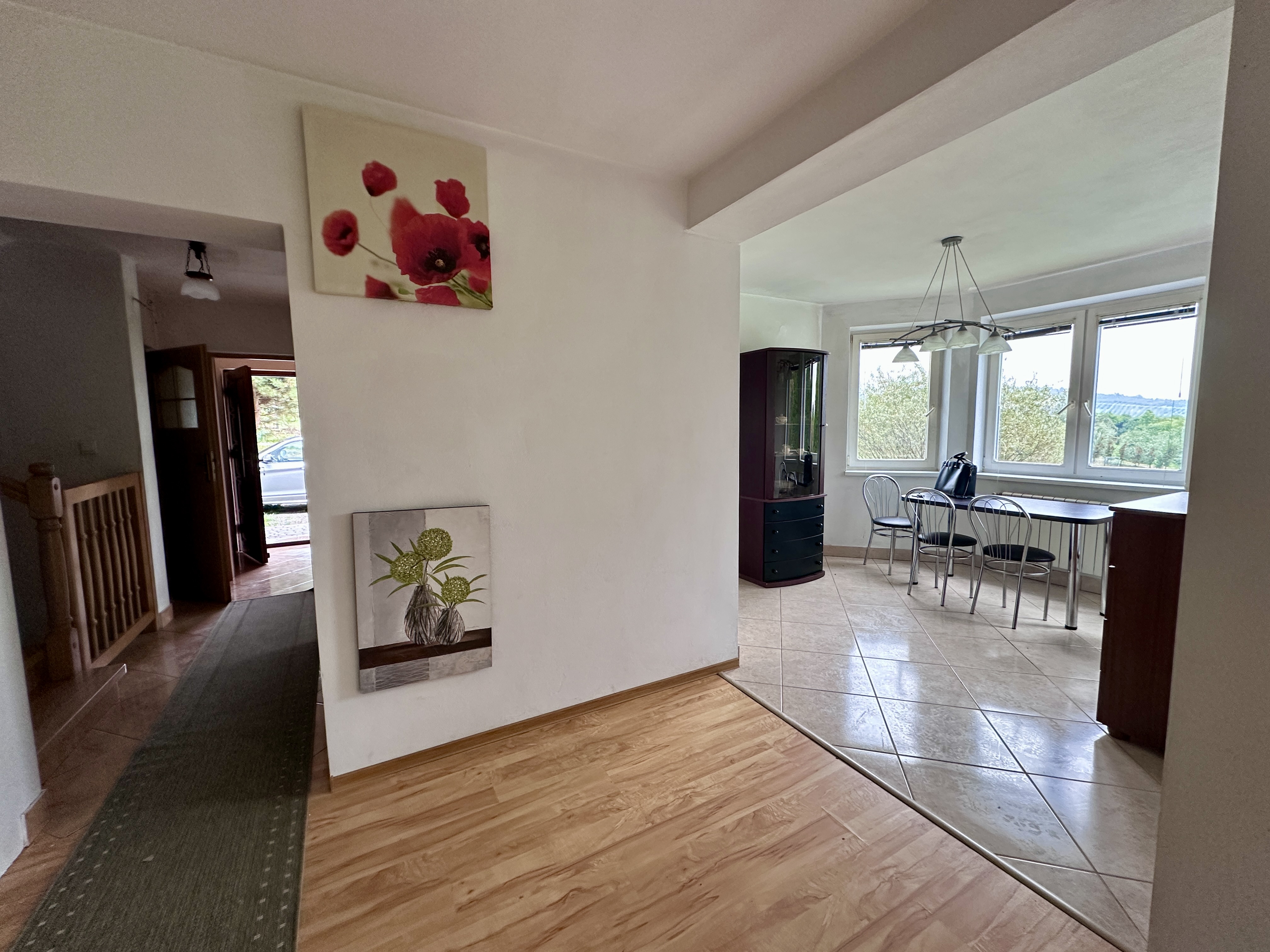 Dom usytuowany jest w kameralnym, zielonym otoczeniu, z pięknym widokiem na góry i lasy. W najbliższej okolicy dominują pola i niezabudowane działki – to doskonała propozycja dla osób, które nie chcą mieć bezpośrednich sąsiadów.
