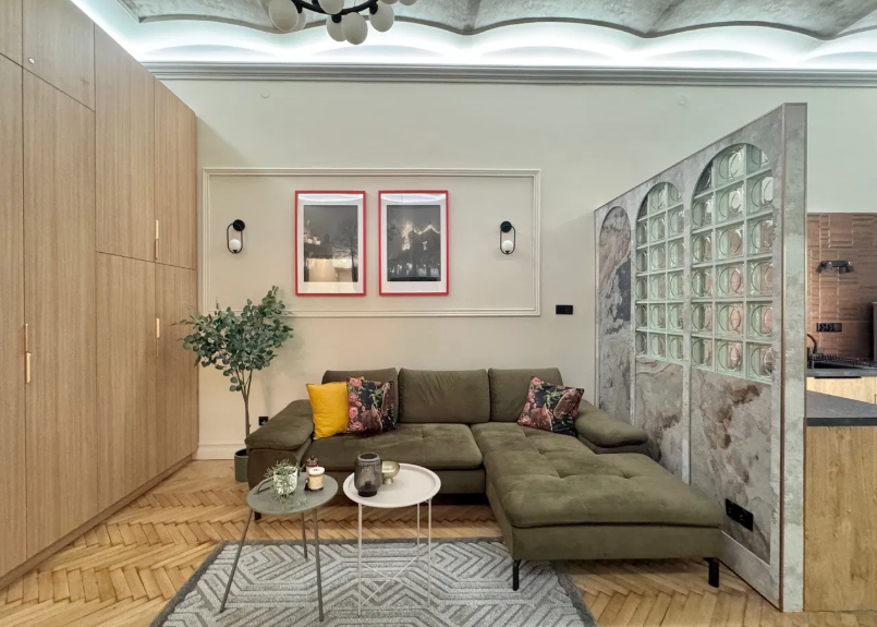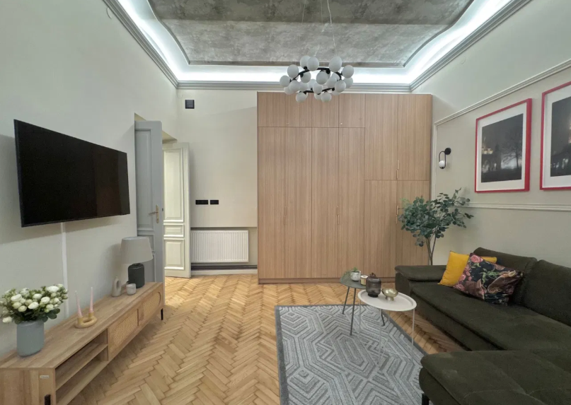 przestronny salon, sypialnia – dzięki wysokiemu sufitowi istnieje możliwość zamontowania antresoli, co pozwala na więcej niż jedno miejsce do spania. Duża garderoba z dodatkową przestrzenią do przechowywania. Do lokalu przynależy również piwnica. Wysokość pomieszczeń: 3,7 m – z nowoczesnym oświetleniem LED, które podkreśla przestronność i elegancję wnętrza