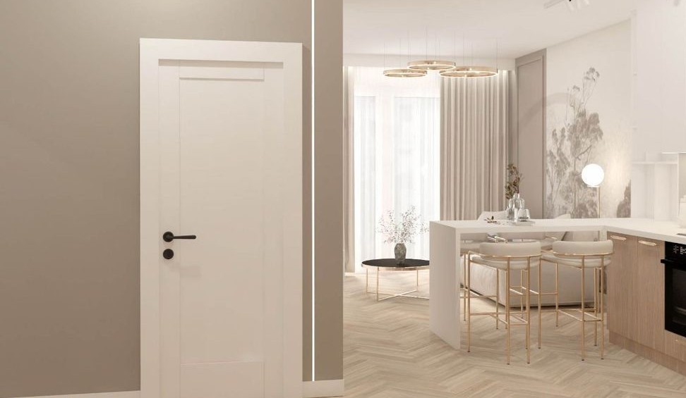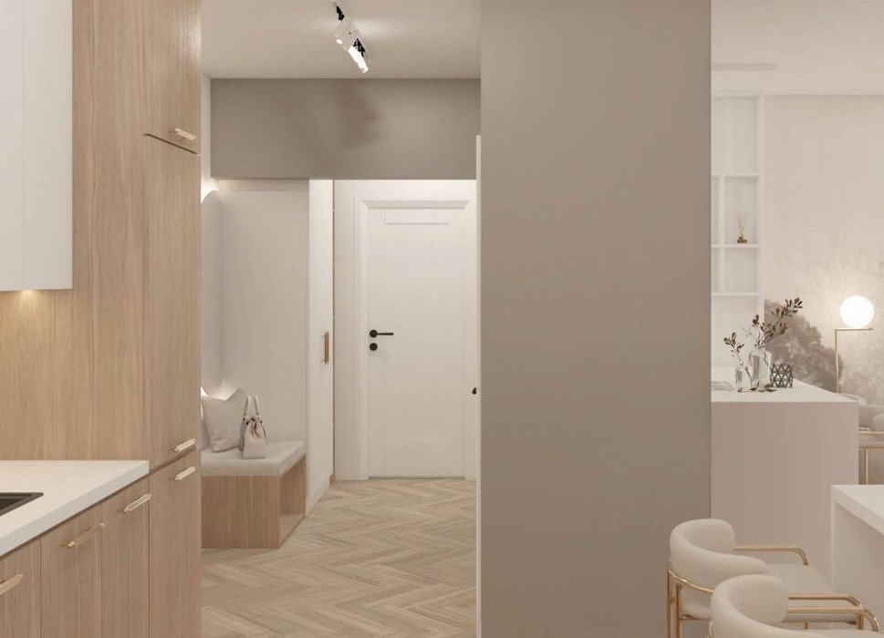 Mieszkanie zostanie wykończone zgodnie z projektem przygotowanym przez doświadczonego architekta wnętrz – przyszli właściciele otrzymują gotową, nowoczesną przestrzeń, wyposażoną w meble i zabudowy widoczne na wizualizacjach (salon z kuchnią, główna sypialnia, korytarz i łazienka). Trzeci pokój pozostaje do indywidualnej aranżacji – idealny jako druga sypialnia lub gabinet.
