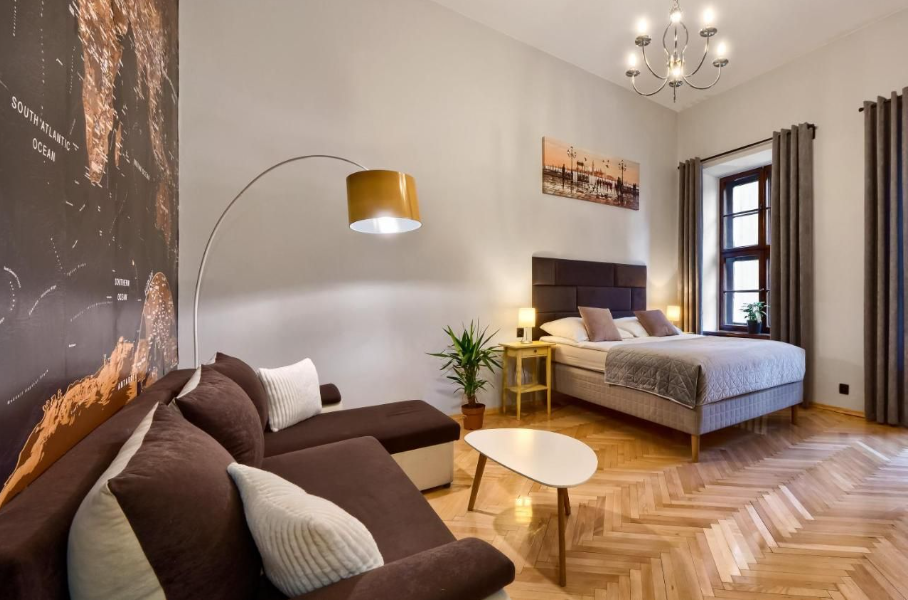 OFERUJEMY PAŃSTWU DO SPRZEDAŻY apartament w ścisłym centrum Starego Miasta. Mieszkanie znajduje się na I piętrze w zabytkowej kamienicy. Powierzchnia apartamentu wynosi 45m2 i w jego skład wchodzi: przestronny pokój podzielony na część sypialnianą z łóżkiem kontynentalnym i dodatkowym materacem oraz wypoczynkową z narożnikiem, ławą i telewizorem.