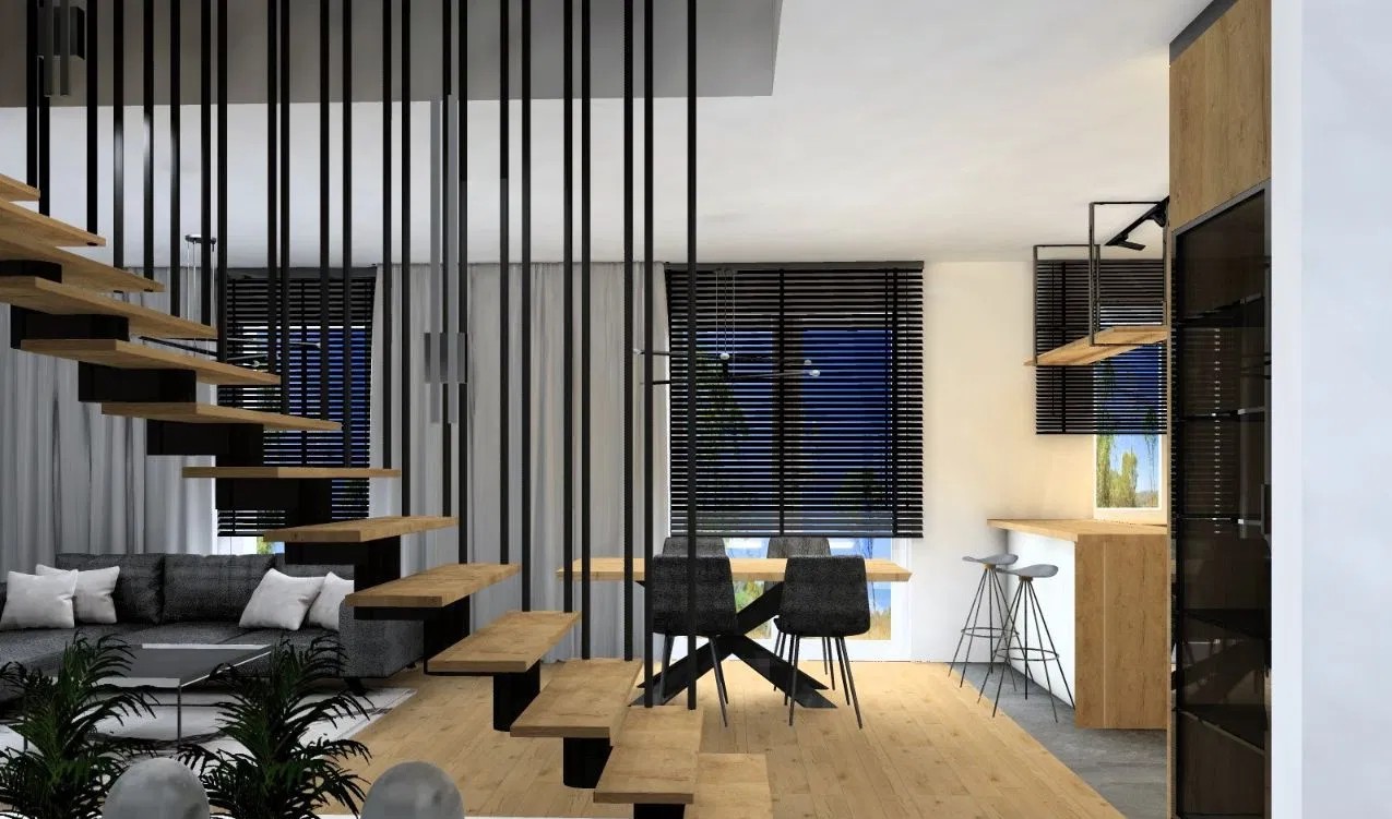Poziom I: salon z aneksem kuchennym, dwie sypialnie, dodatkowy pokój, gabinet, łazienka oraz wiatrołap