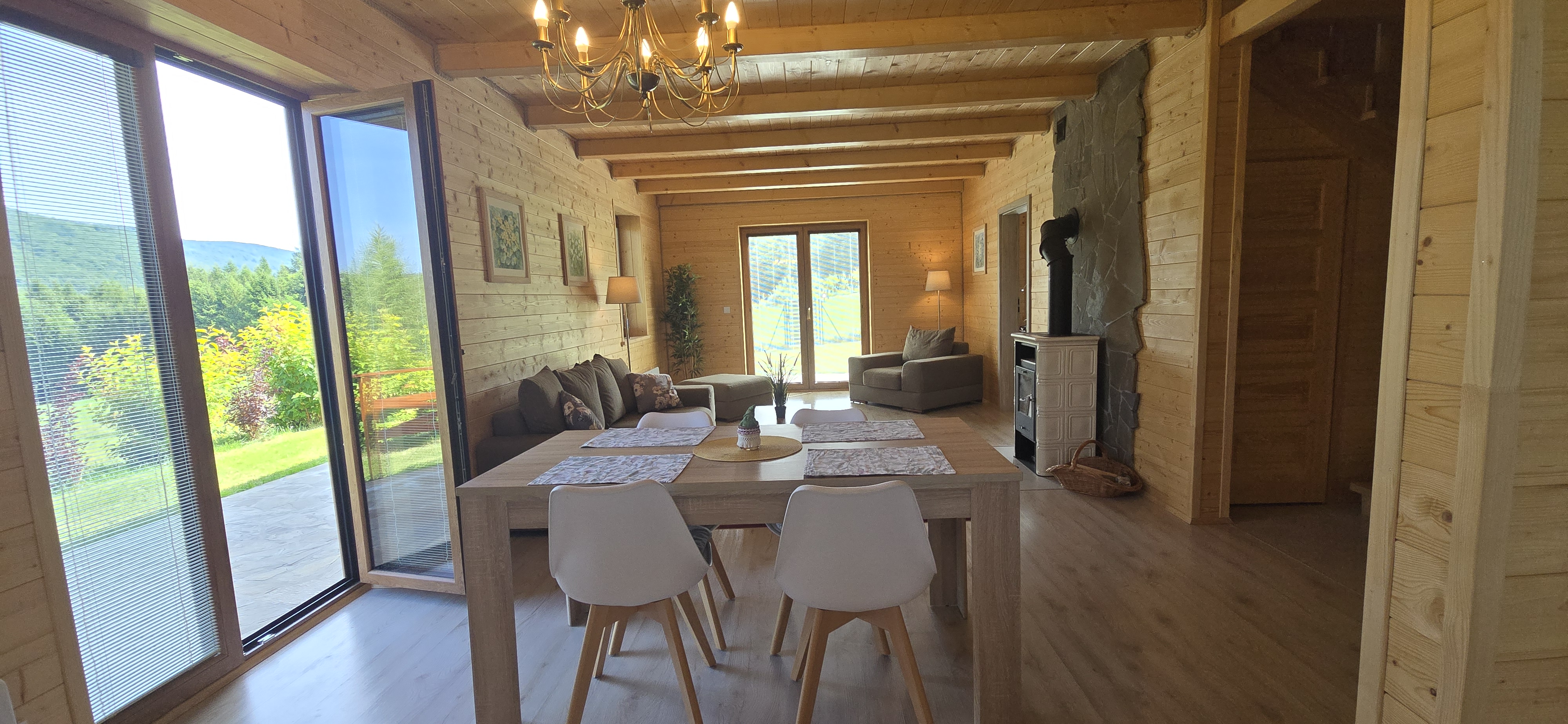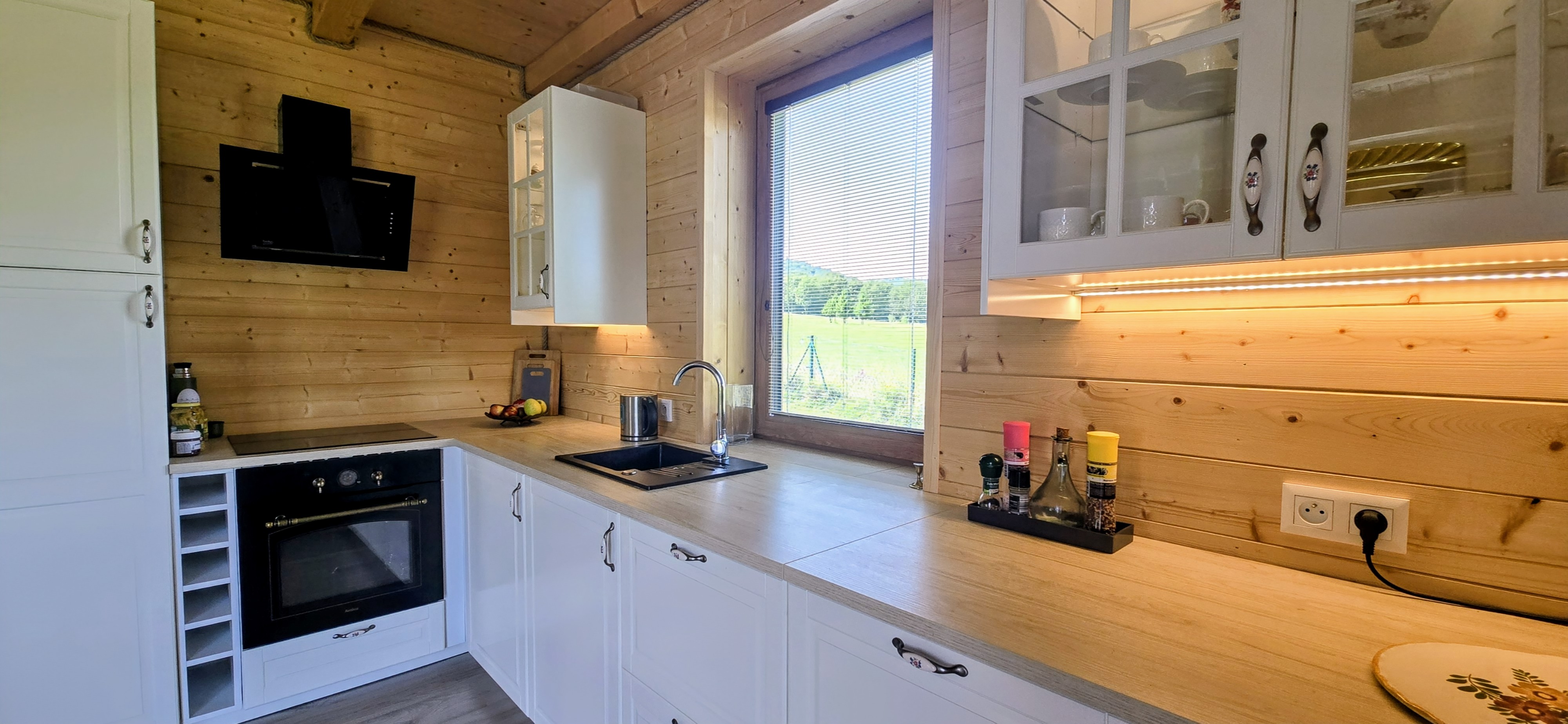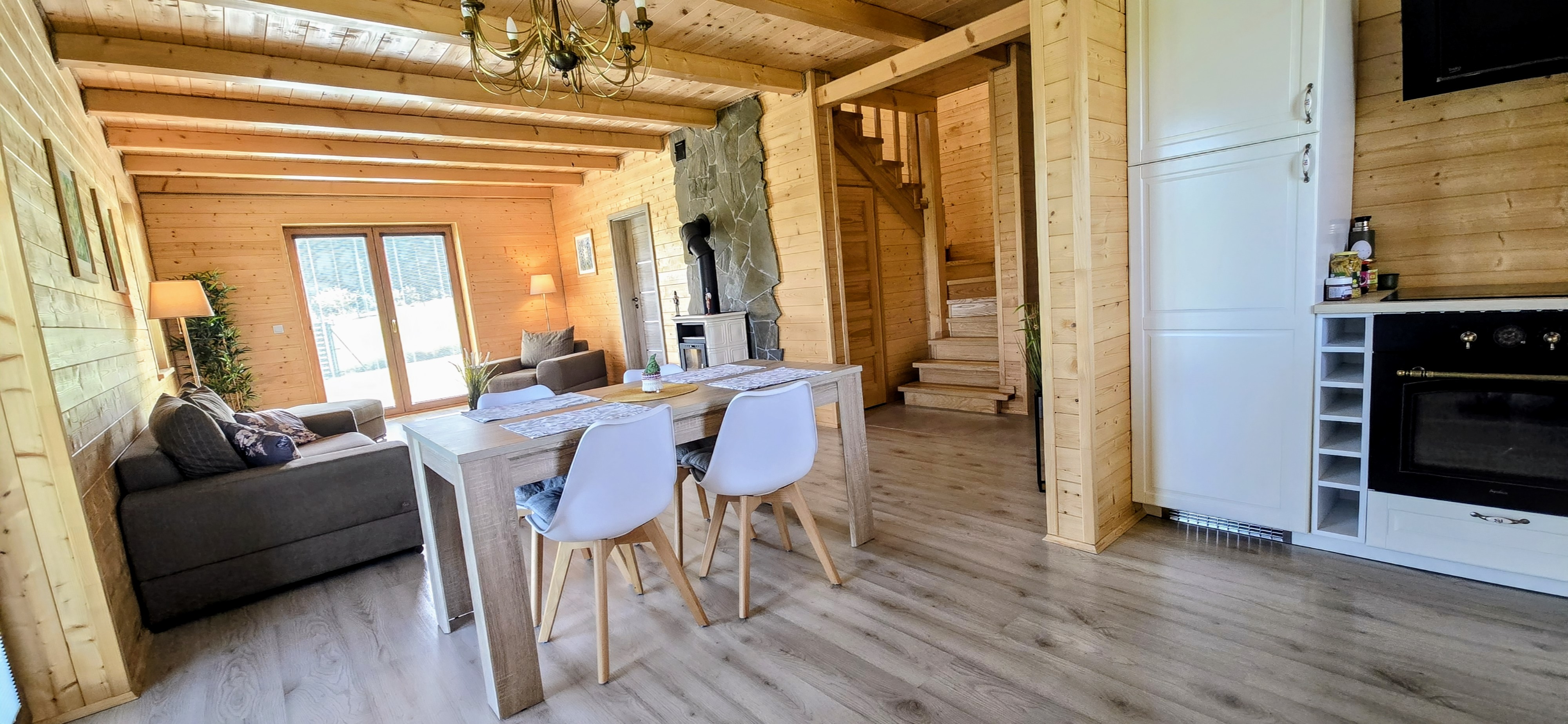 Otwarta kuchnia z jadalnią – w pełni wyposażona, z oknem wychodzącym na ogród