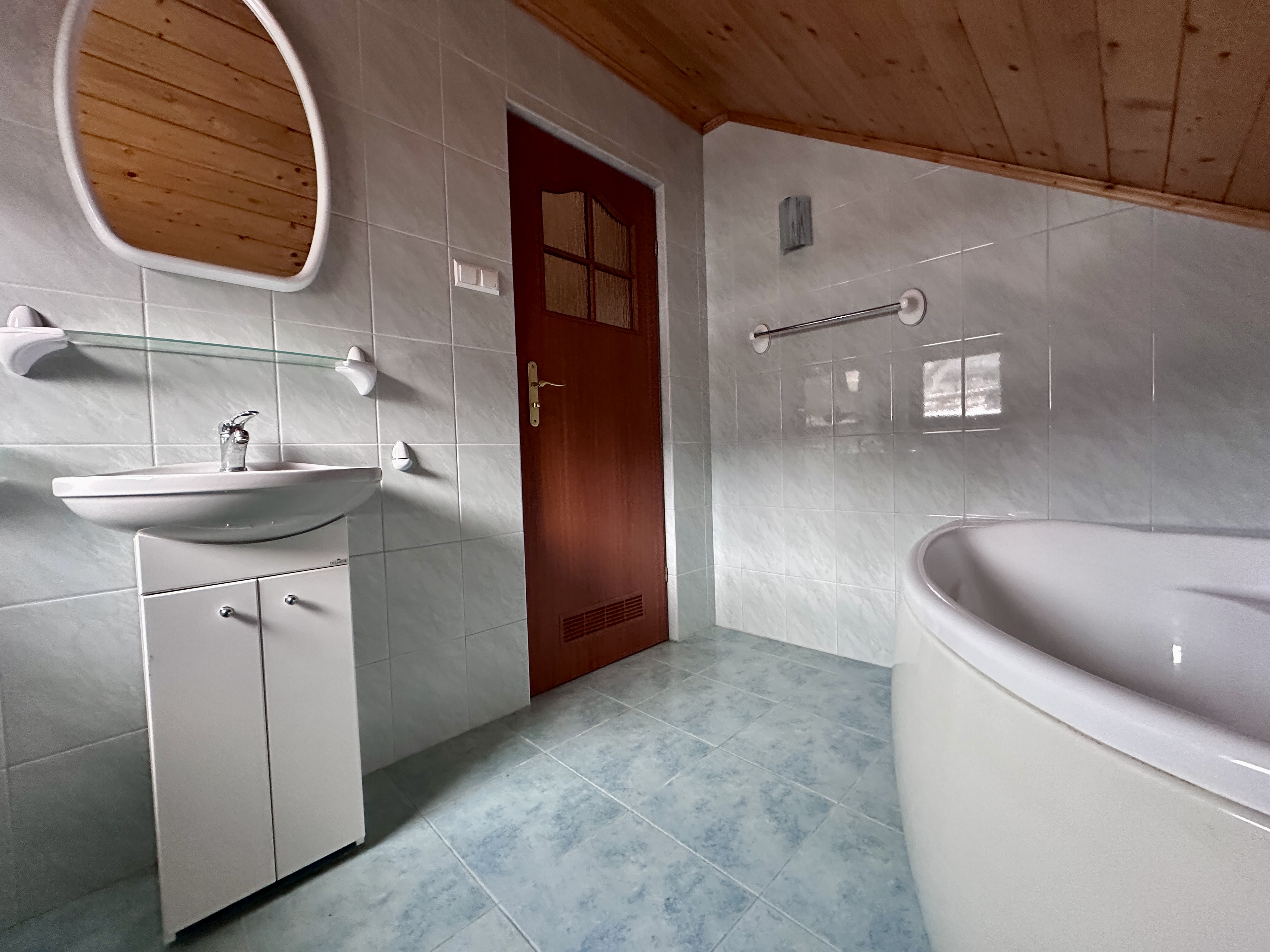 Piętro: trzy pokoje pełniące funkcję sypialni , jeden z nich oferuje zadaszony balkon z którego jest widok wprost na Babią Górę oraz duża łazienka z wanną