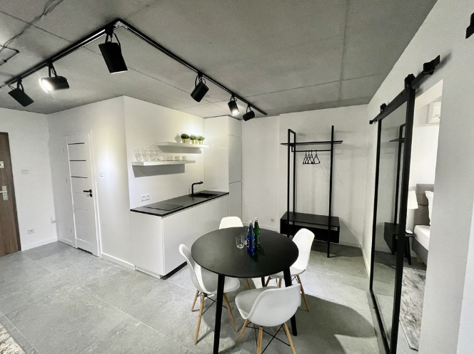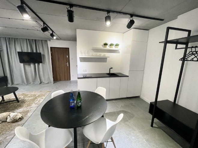 - do lokalu doprowadzony jest światłowód; Wyposażenie: łazienka z prysznicem, wykończona podłoga: płytki gresowe 60 cm x 120 cm + dywany w części sypialnianej i salonie, kompletna kuchnia z pełnym wyposażeniem AGD, komplet mebli (zgodnie ze zdjęciami); kompletna i rozprowadzona instalacja elektryczna.