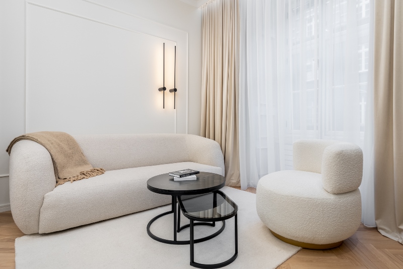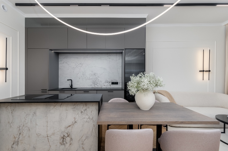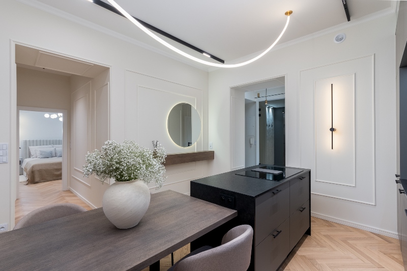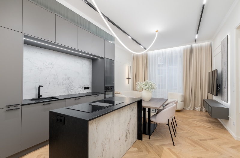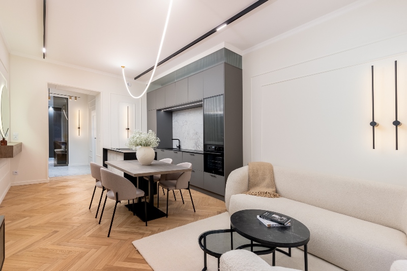 – Przestronny nowoczesny salon z wyposażonym aneksem kuchennym