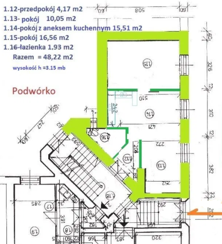 Apartament mieści się na wysokim parterze w kamienicy w rejonie ul. Skawińskiej, ul. Wietora na Kazimierzu. Mieszkanie o powierzchni 48,20m2 składa się z: przedpokoju (4,17 m²), sypialni (16,56 m²), kuchni (15,51 m²) połączonej z pokojem ( 10,05 m² ) razem 25,55 m², łazienki z WC (1,93 m²), możliwość wydzielenia/odtworzenia trzeciego pokoju ~10 m2. Otwarta architektura, i wysokie stropy ( wysokość 3.15 m) dają poczucie przestrzeni a oświetlenie wnętrz, pozwala na stworzenie niepowtarzalnej atmosfery oraz podkreśleniem eleganckiej stylistyki i charakteru apartamentu.