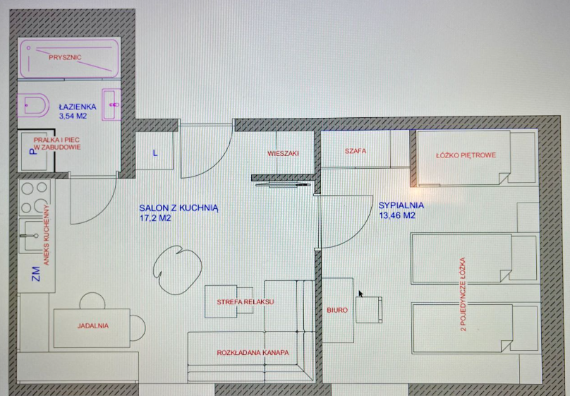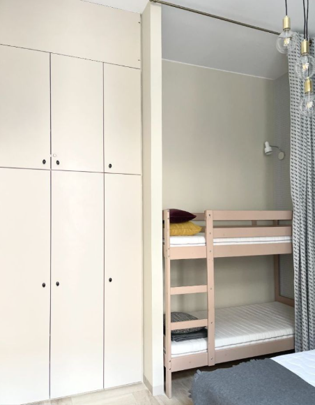- sypialnia: szafa na wymiar, dwa pojedyncze łóżka (można łączyć lub rozsuwać), biurko, krzesło, stoliki nocne, łóżko piętrowe.