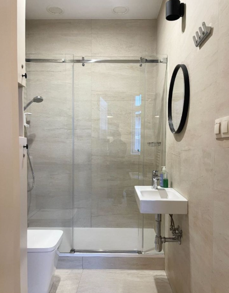 - łazienka : kabina prysznicowa 70cm x160 cm z przesuwnymi drzwiami, umywalka, toaleta, kaloryfer, pralka w zabudowie meblowej, piec gazowy z zamkniętą komorą spalania,
