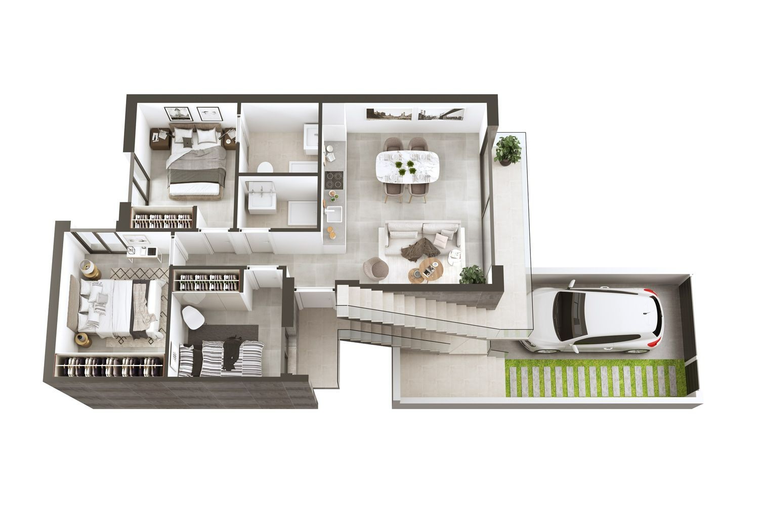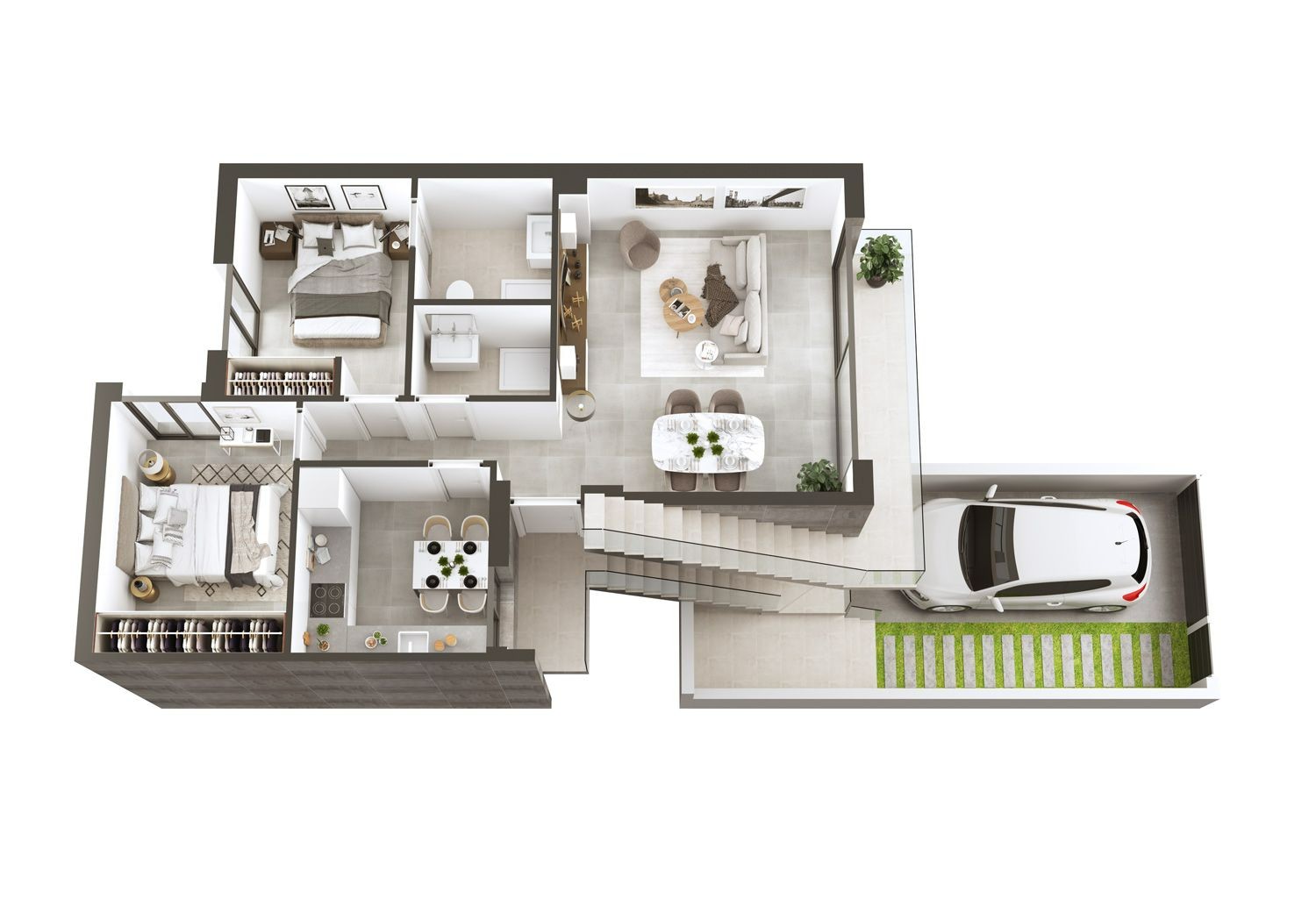 Nowa koncepcja mieszkania na parterze z różnymi opcjami dystrybucji, 2 lub 3 sypialniami, niezależną lub zintegrowaną kuchnią w salonie, 2 łazienkami, prywatnego ogrodu oraz miejsca parkingowego.