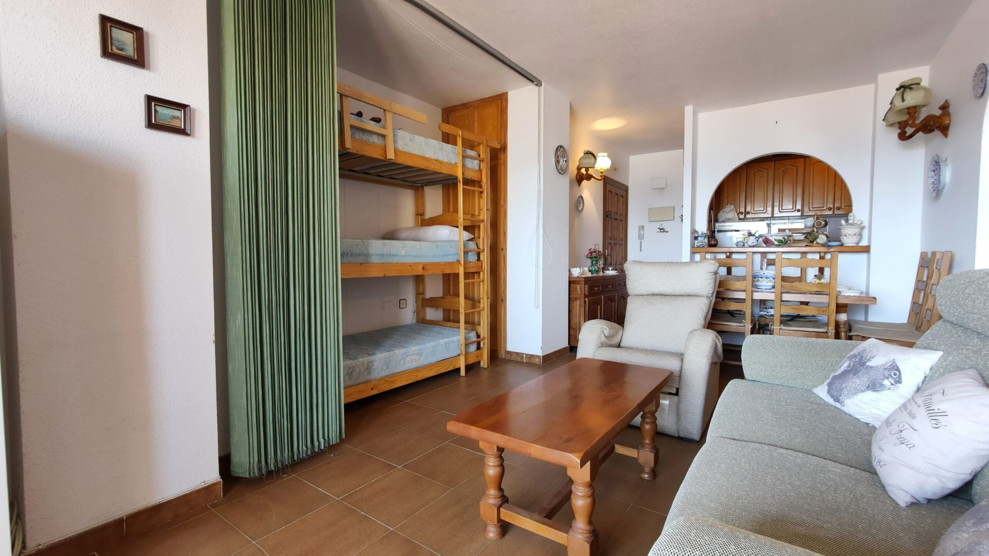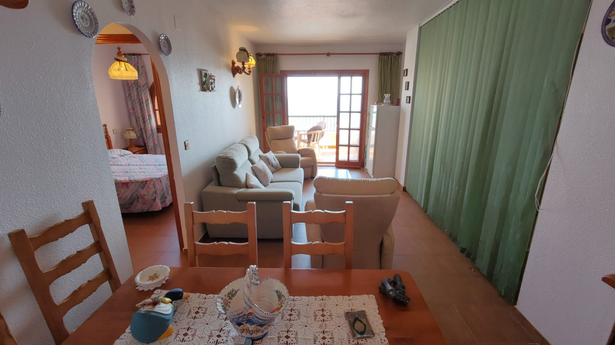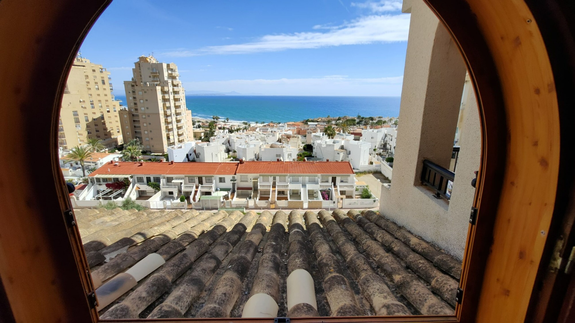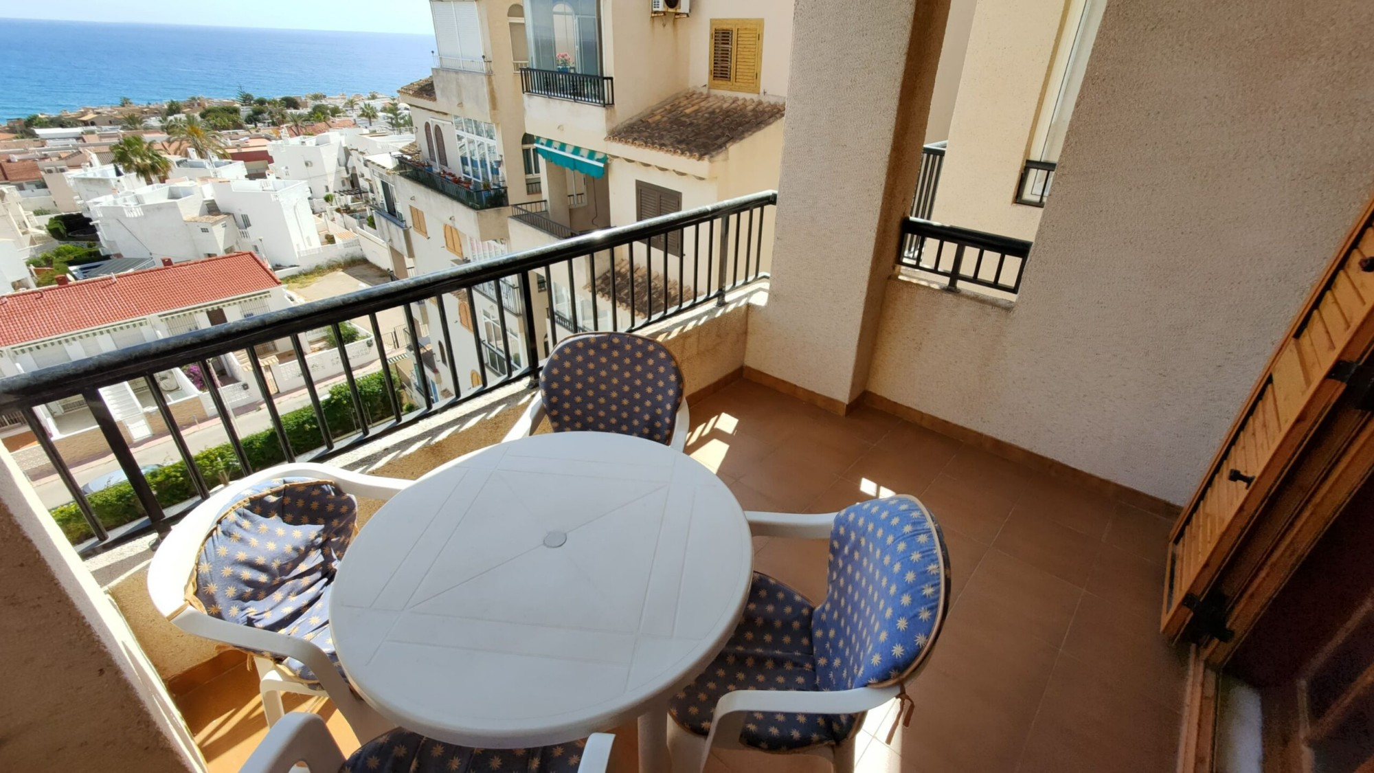 Ten apartament na 5. piętrze został bardzo dobrze utrzymany i oferuje 1 dużą sypialnię z wbudowaną szafą, z której można podziwiać piękny widok na morze z łóżka, 1 łazienkę z wanną i oknem, częściowo niezależną kuchnię z oknem, przestronną pokój dzienny z jadalnią oraz wydzieloną częścią, w której właściciele umieścili trzyosobowe łóżko piętrowe. I wreszcie, co nie mniej ważne, duży taras z przepięknym, niezakłóconym widokiem na morze i plażę La Mata!