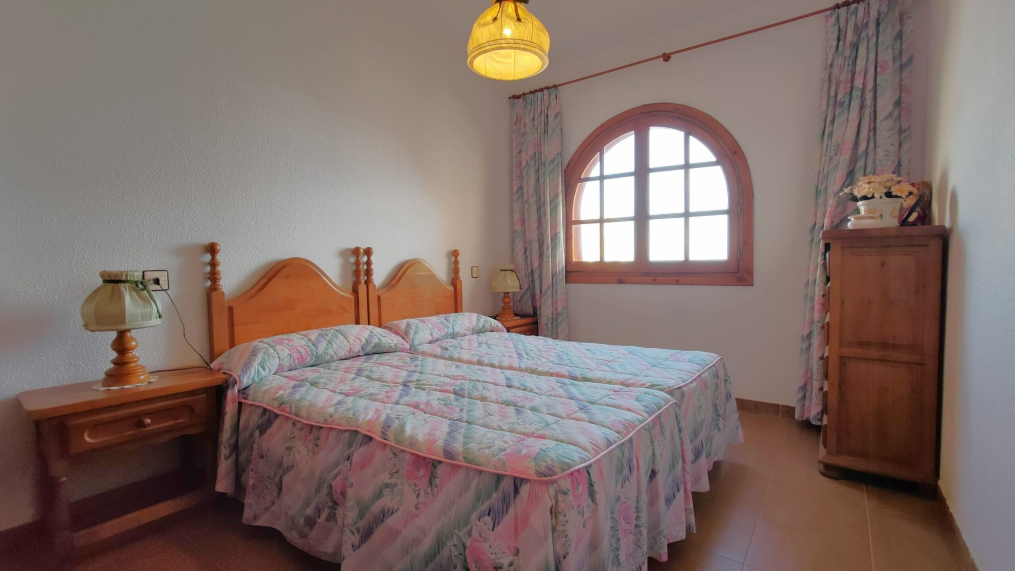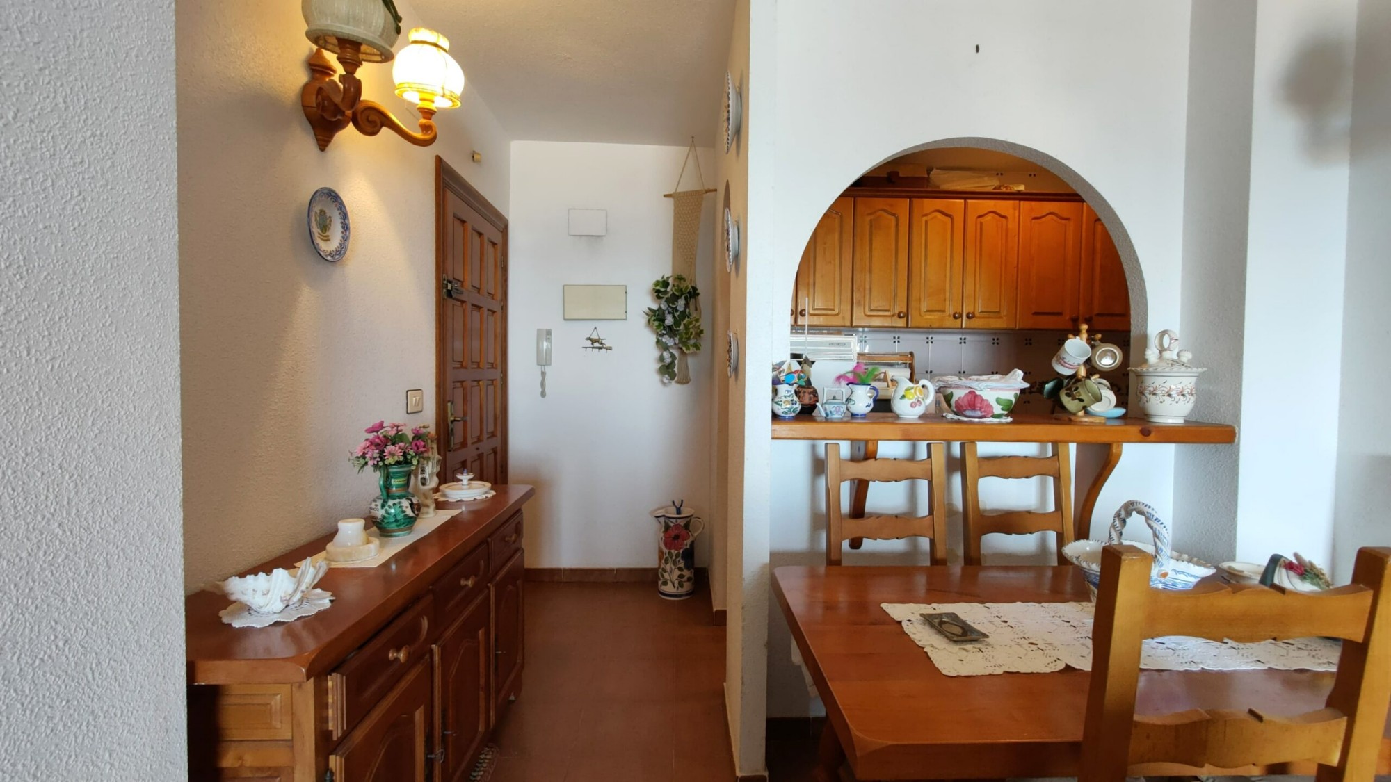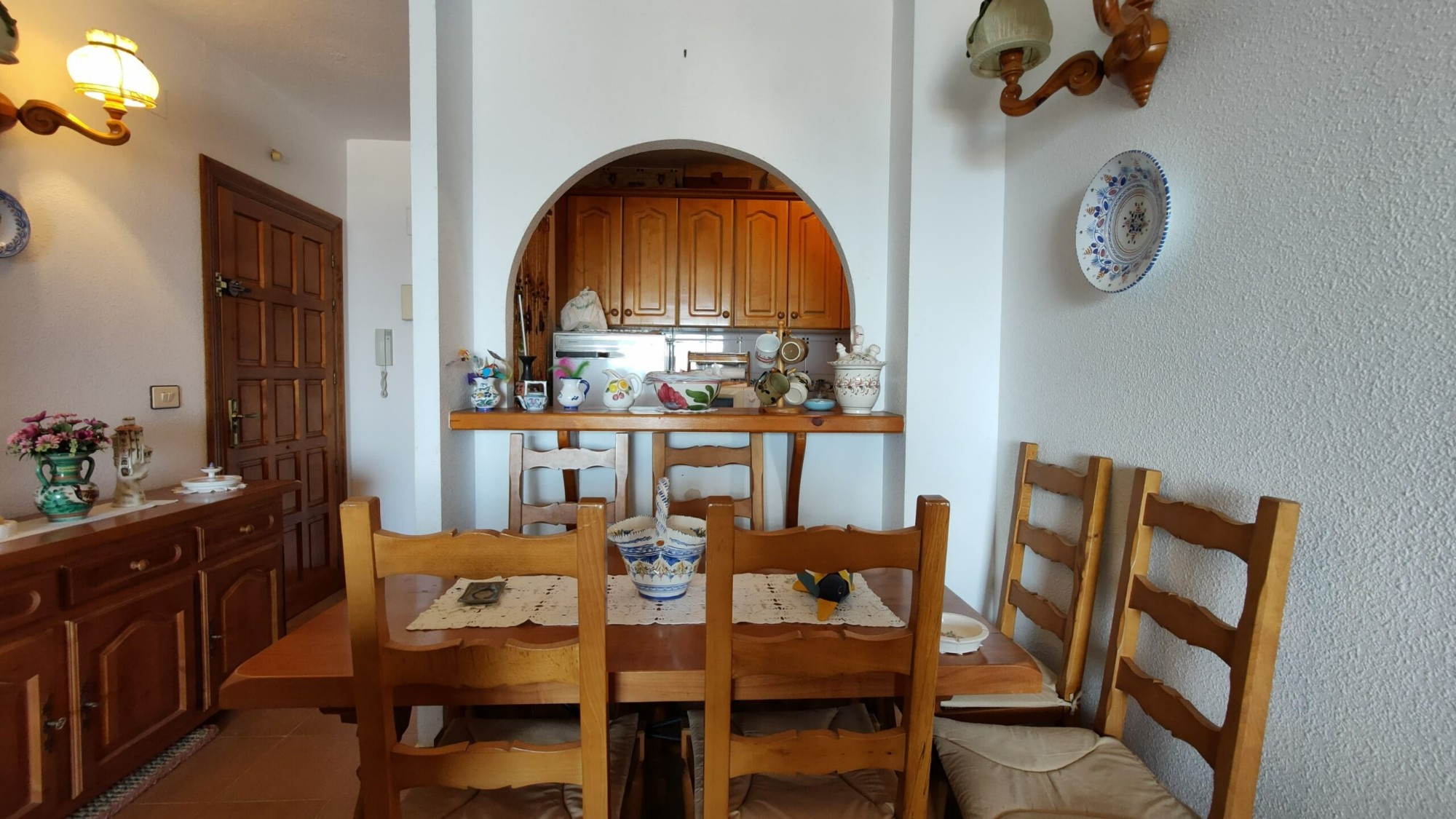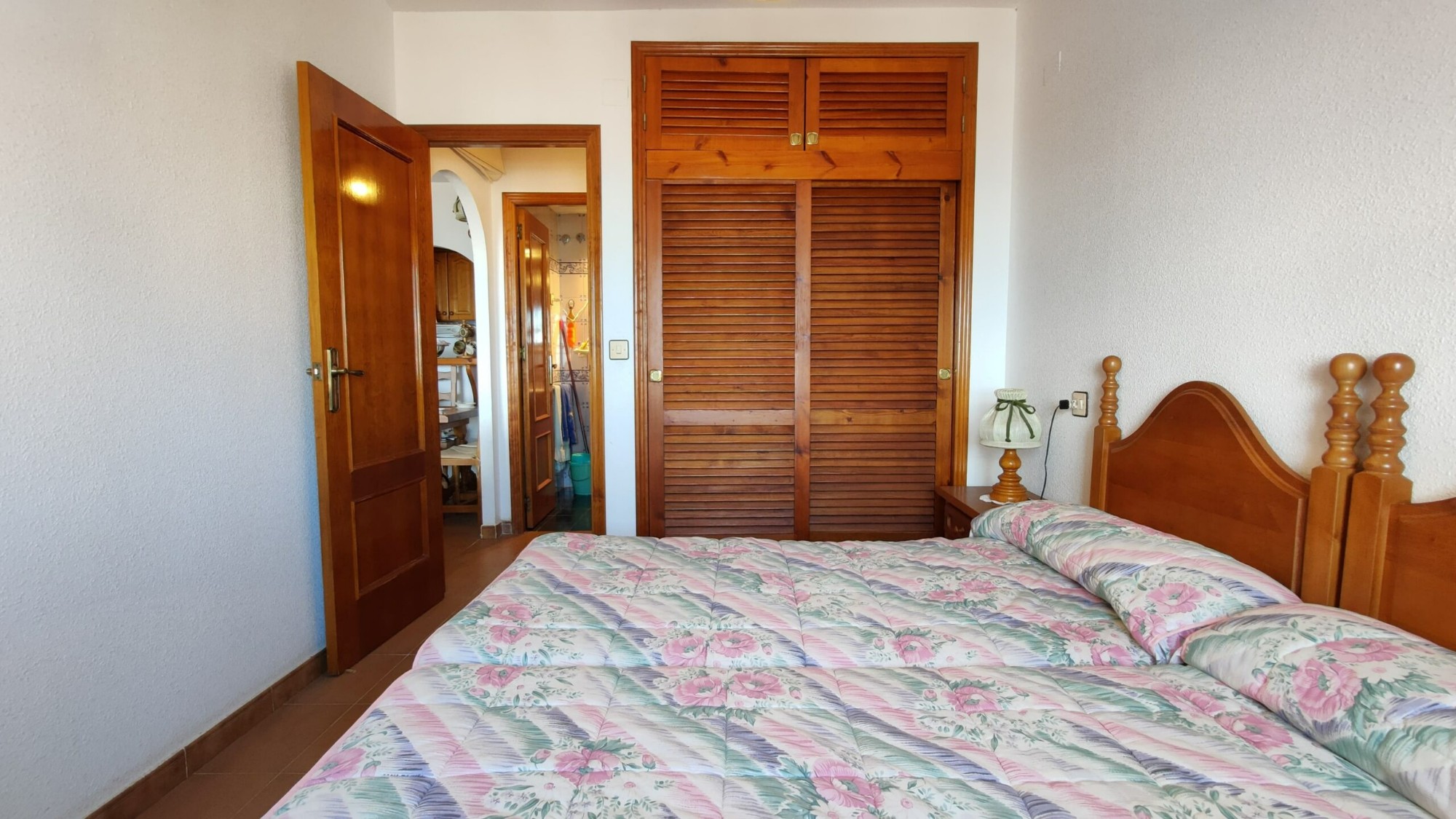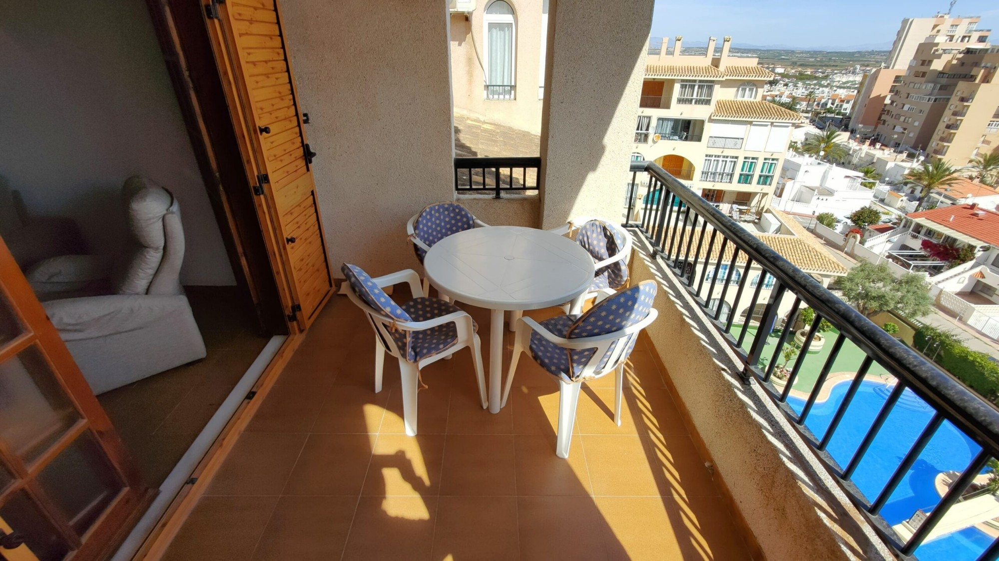 Ten apartament na 5. piętrze został bardzo dobrze utrzymany i oferuje 1 dużą sypialnię z wbudowaną szafą, z której można podziwiać piękny widok na morze z łóżka, 1 łazienkę z wanną i oknem, częściowo niezależną kuchnię z oknem, przestronną pokój dzienny z jadalnią oraz wydzieloną częścią, w której właściciele umieścili trzyosobowe łóżko piętrowe. I wreszcie, co nie mniej ważne, duży taras z przepięknym, niezakłóconym widokiem na morze i plażę La Mata!