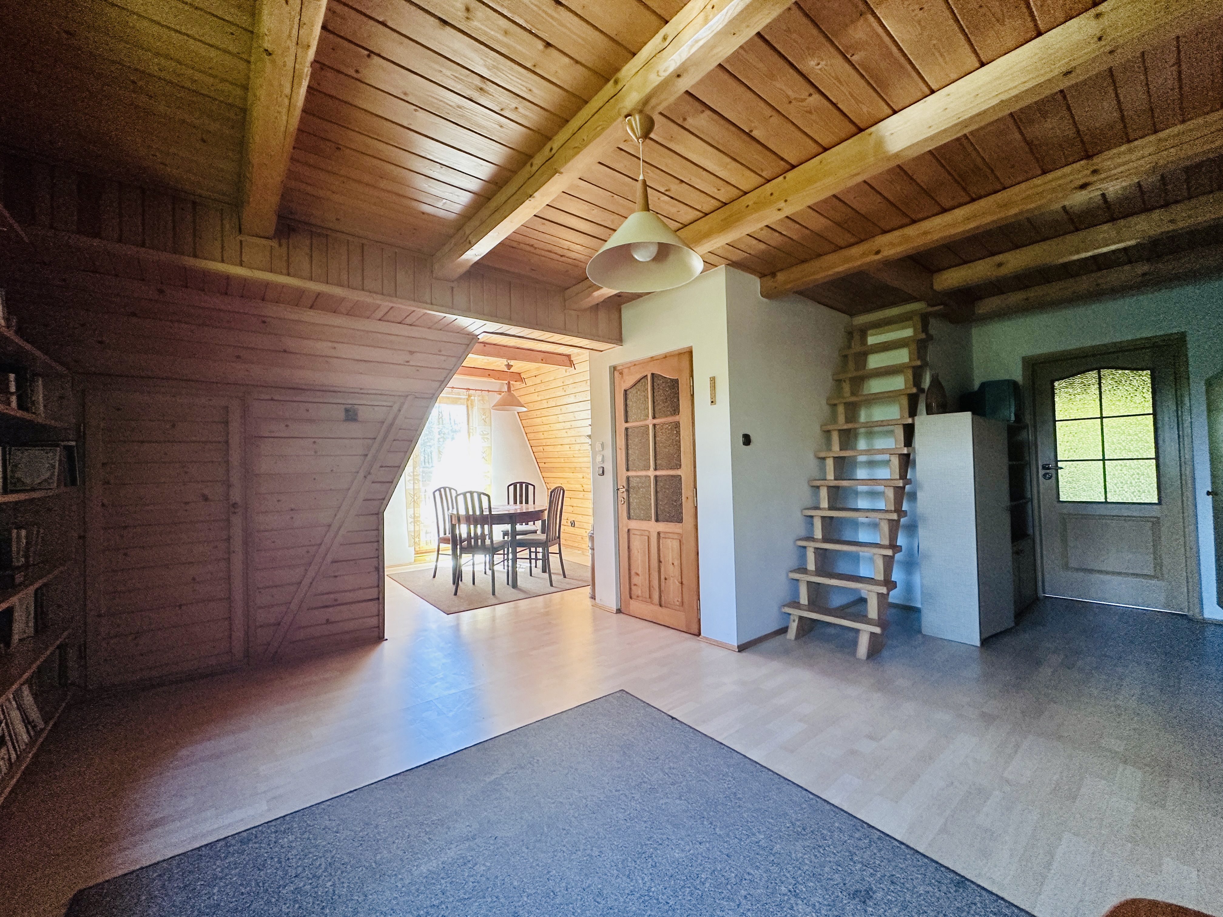 Dolna część domu wykończona boazerią – nadaje wnętrzom ciepły i przytulny charakter