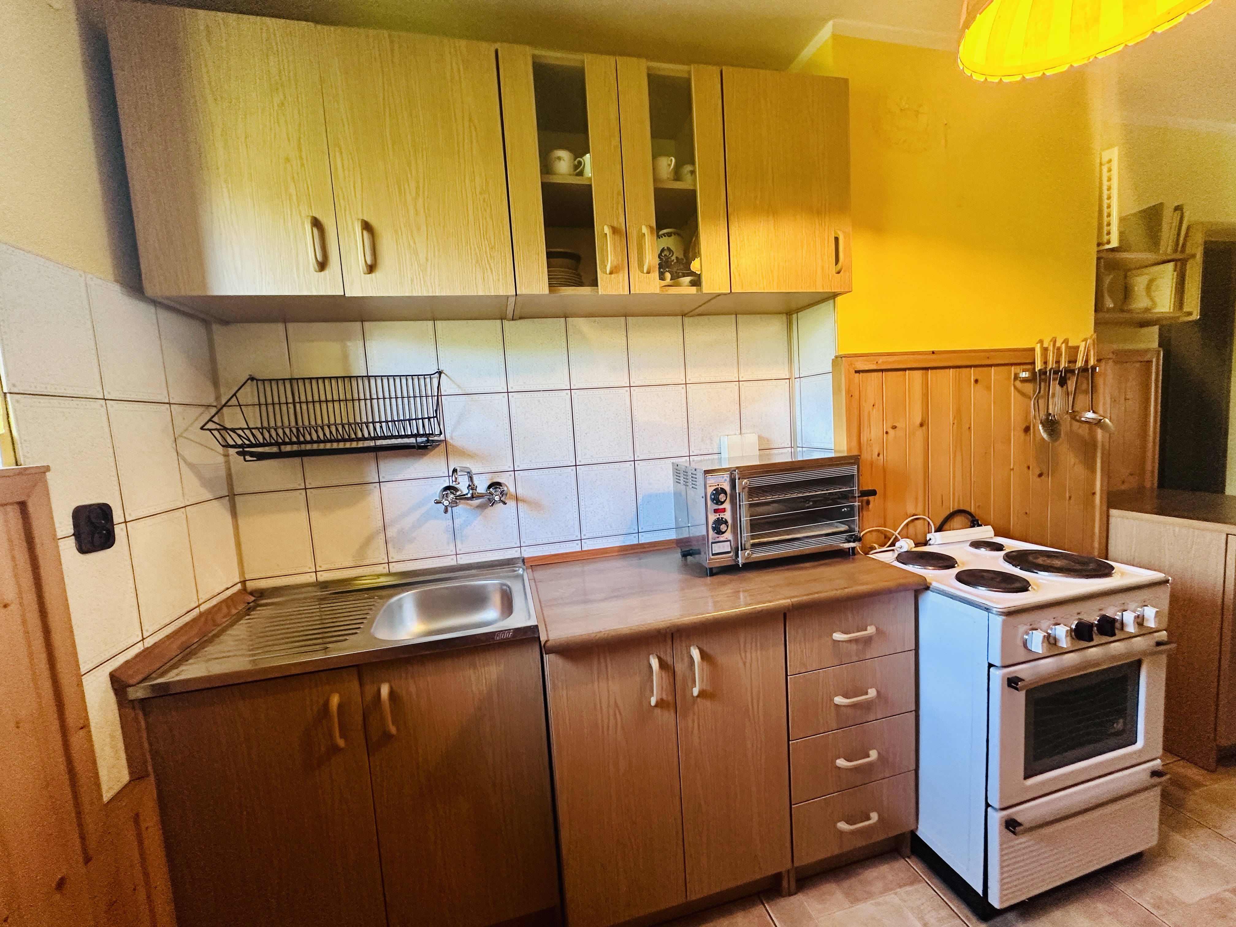Ogrzewanie zapewnia piec węglowy, a przytulną atmosferę dopełnia funkcjonalny kominek, woda w sezonie letnim podgrzewana w bojlerze elektrycznym