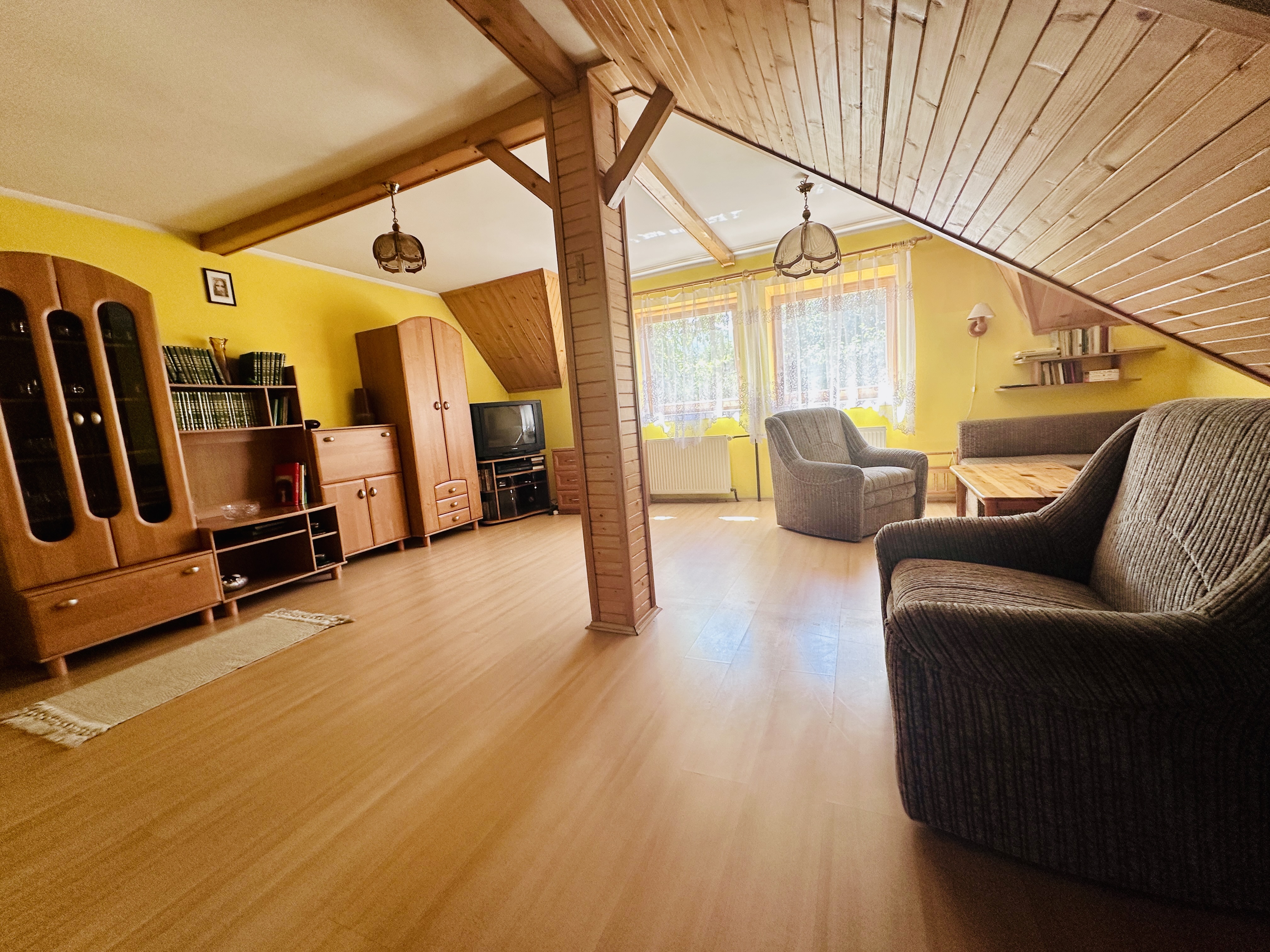 Poddasze: duży salon z częścią wypoczynkową, sypialnia z wyjściem na balkon, aneks kuchenny, łazienka