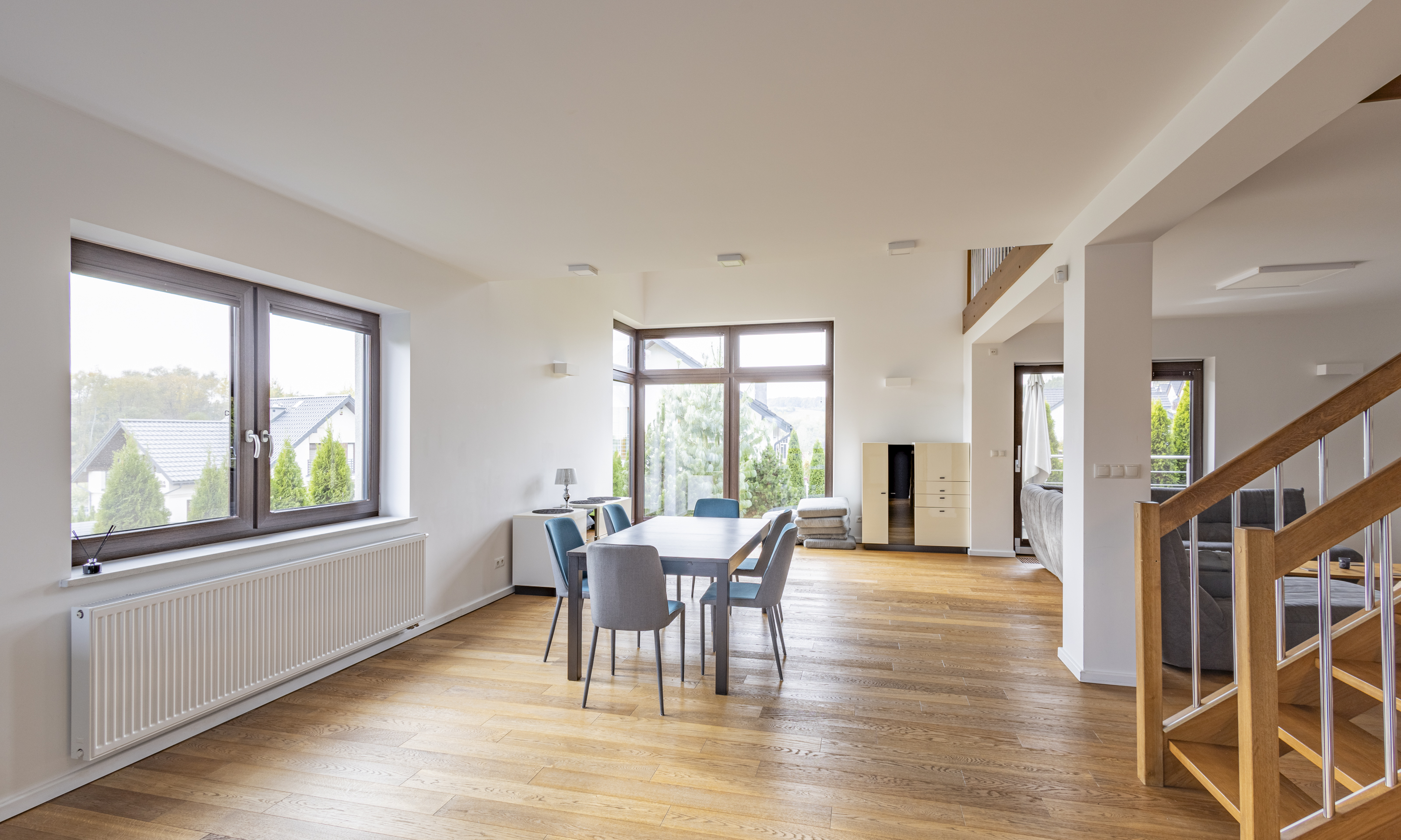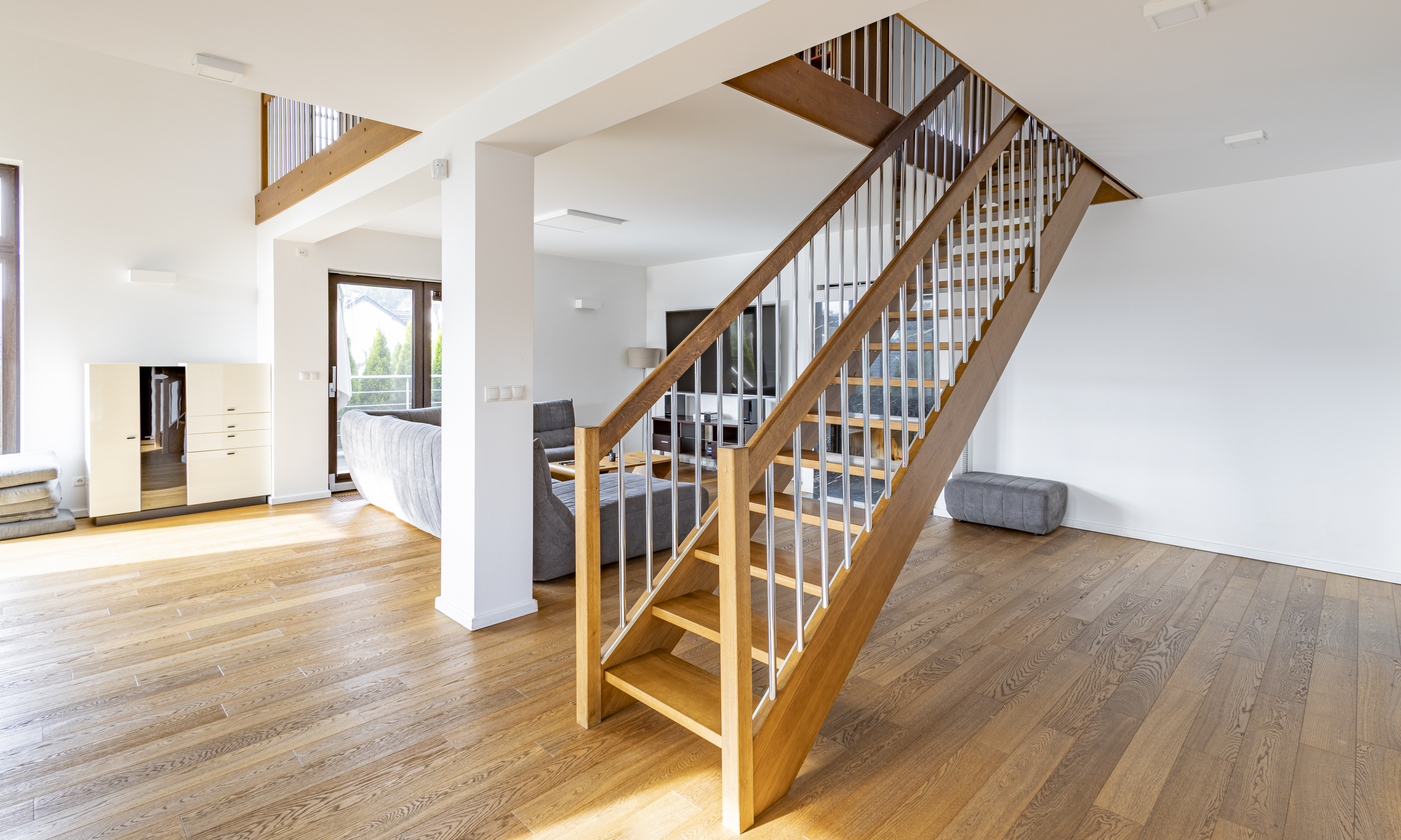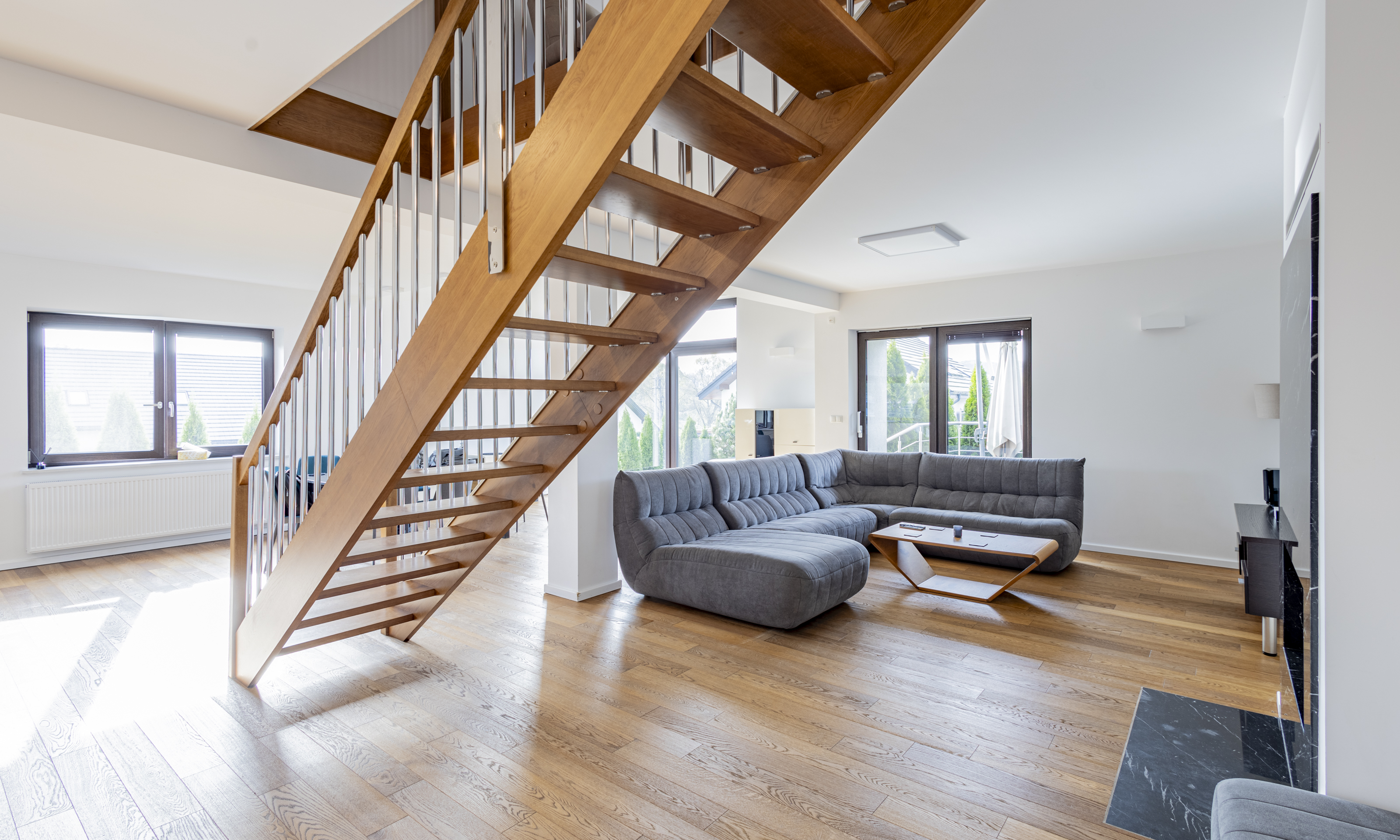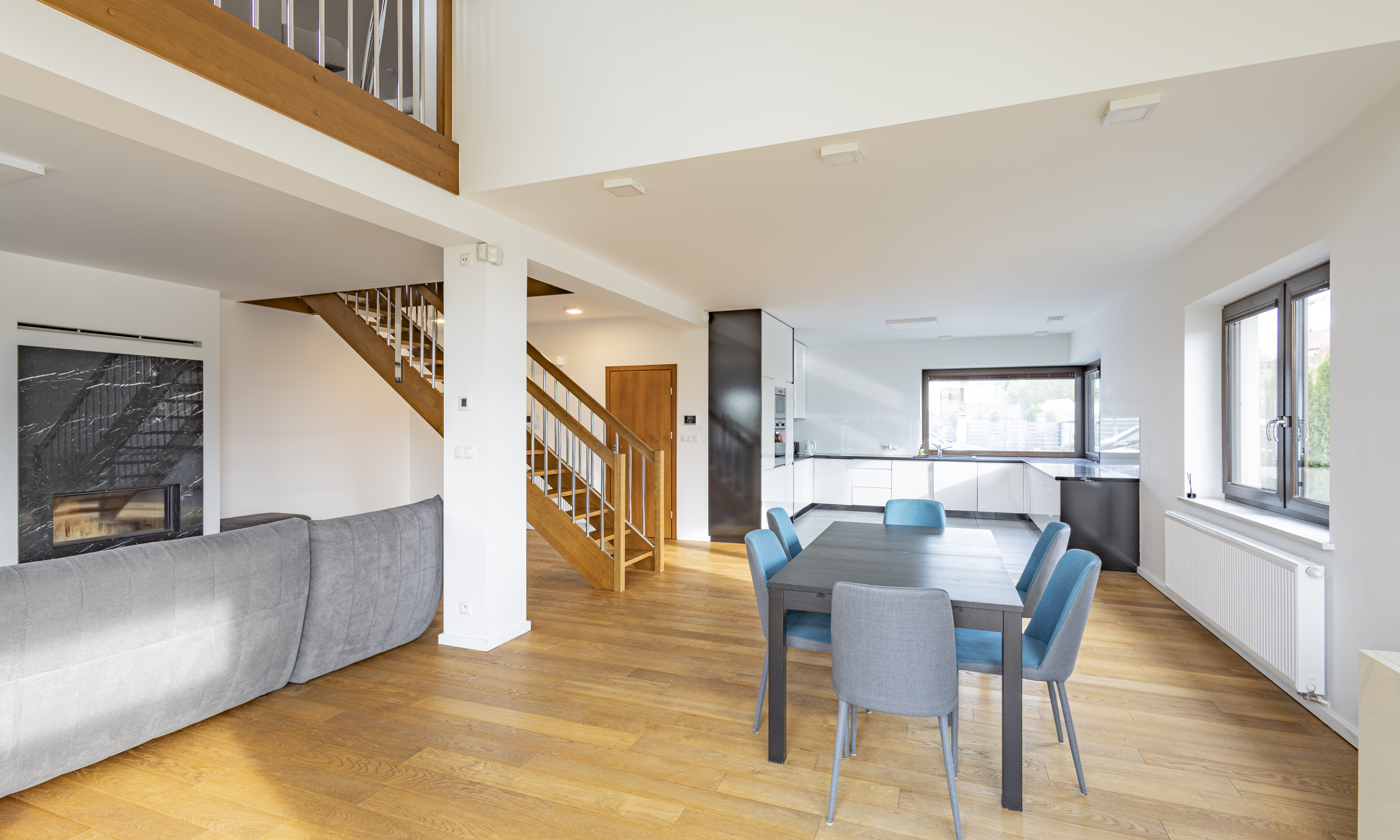 Dom w stanie do wejścia. Na podłodze wysokiej klasy drewniane deski. Stolarka drzwiowa oraz schody wykonane z litego drewna.