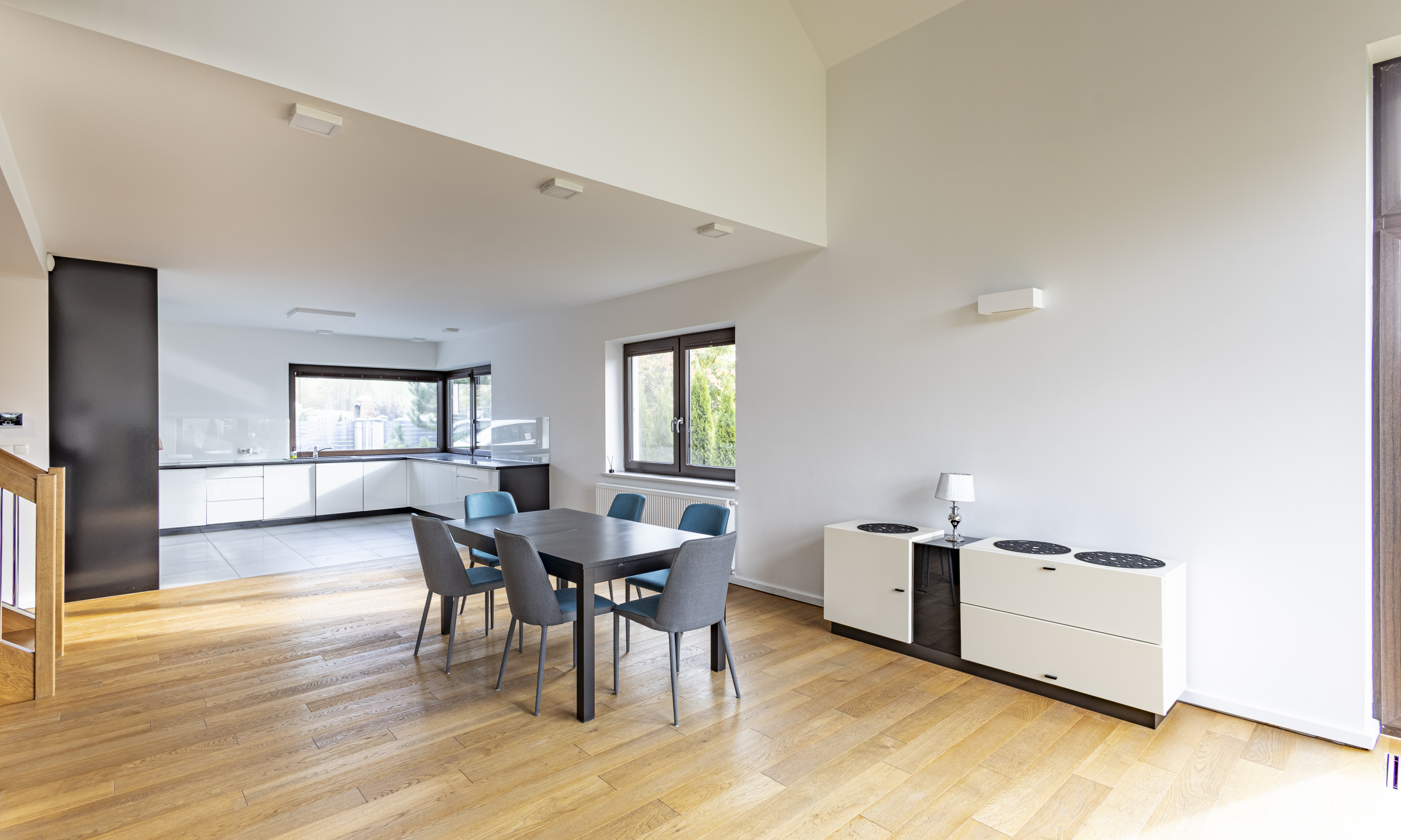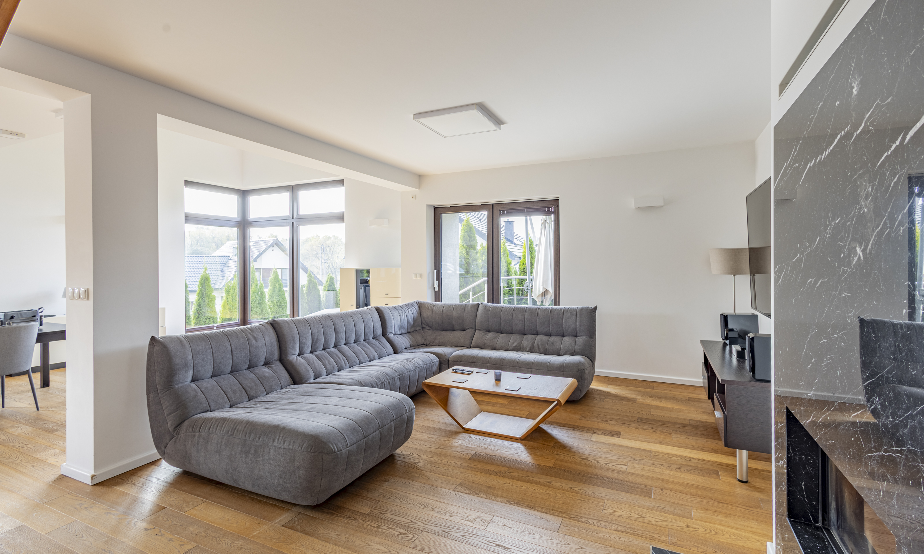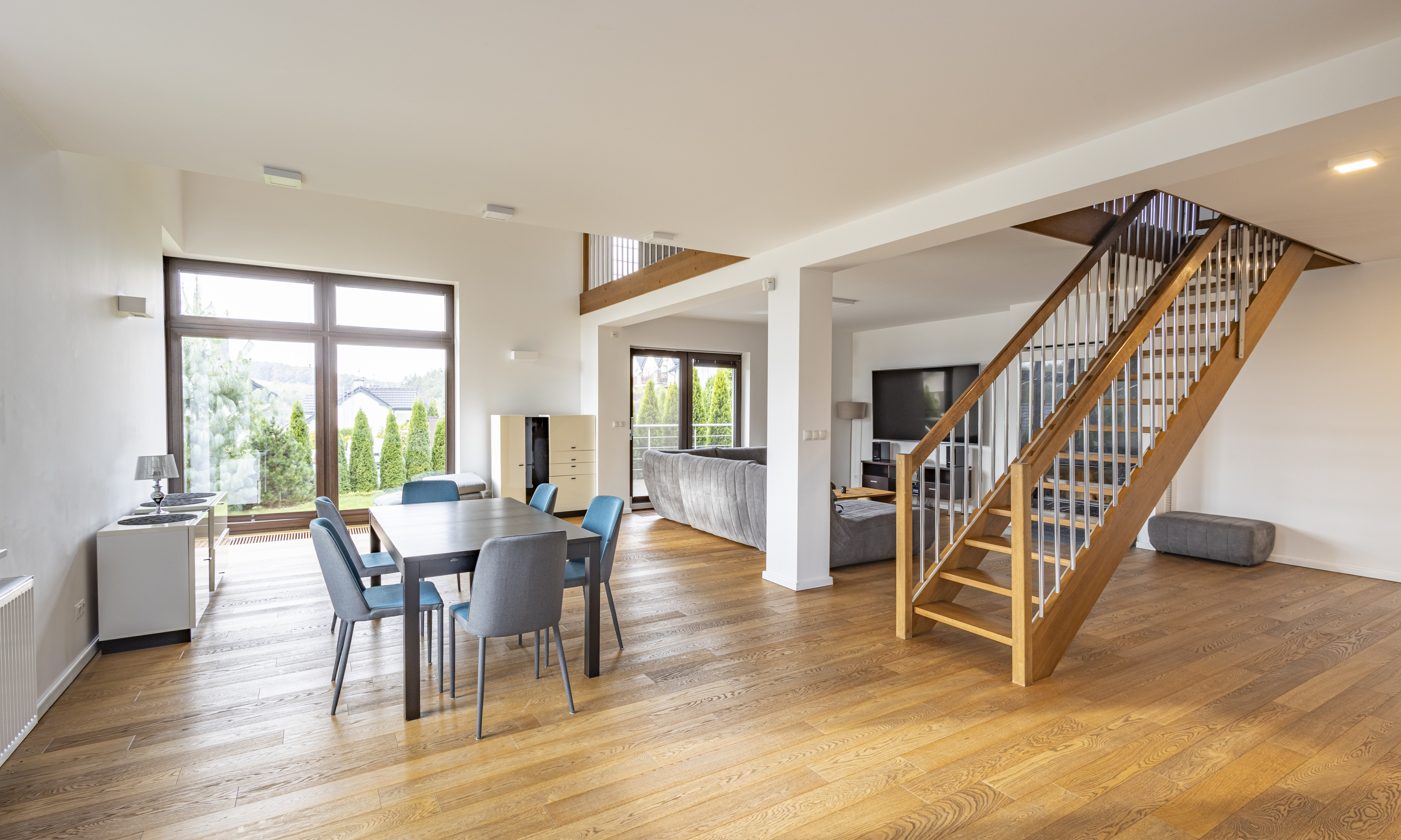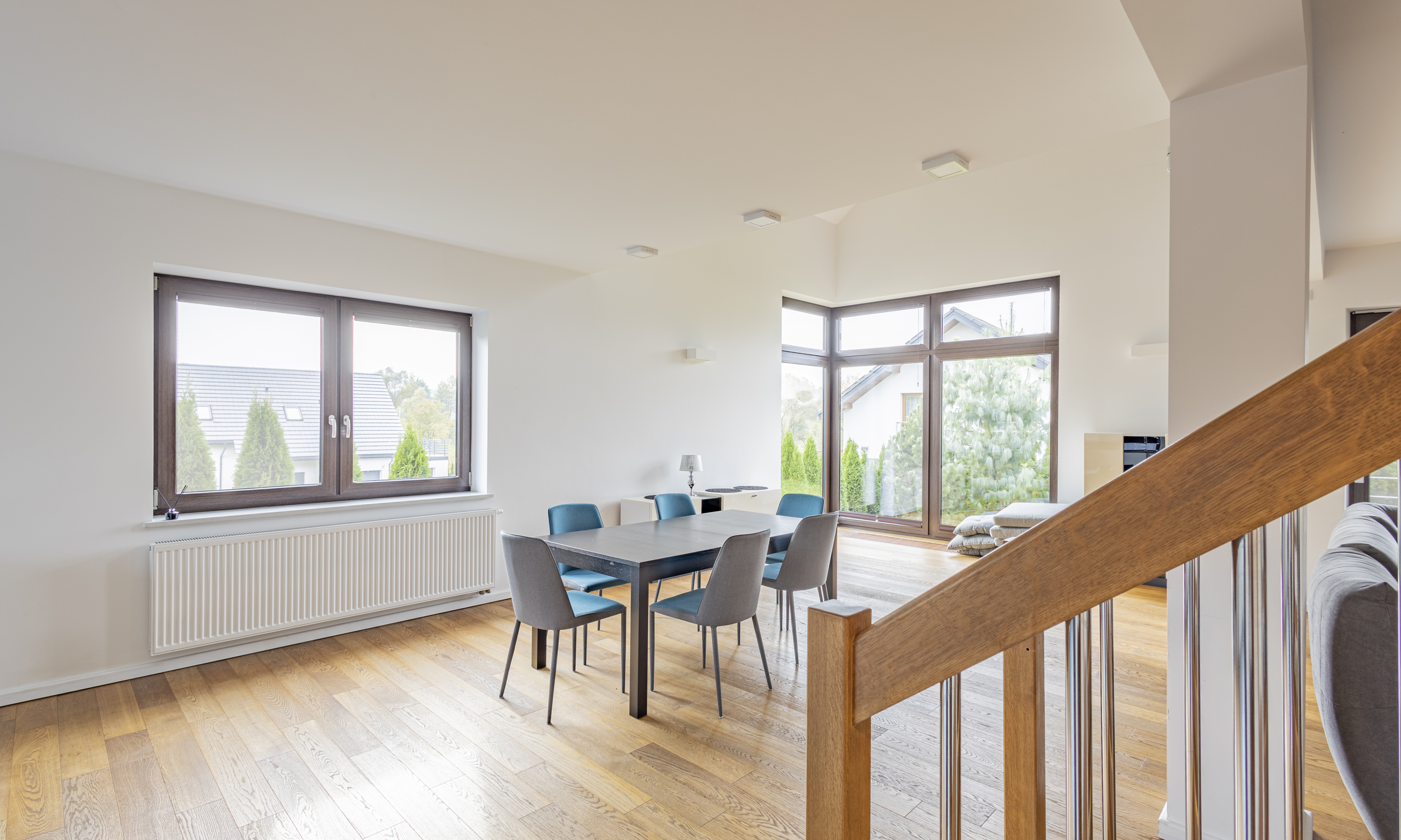 Dom w stanie do wejścia. Na podłodze wysokiej klasy drewniane deski. Stolarka drzwiowa oraz schody wykonane z litego drewna.