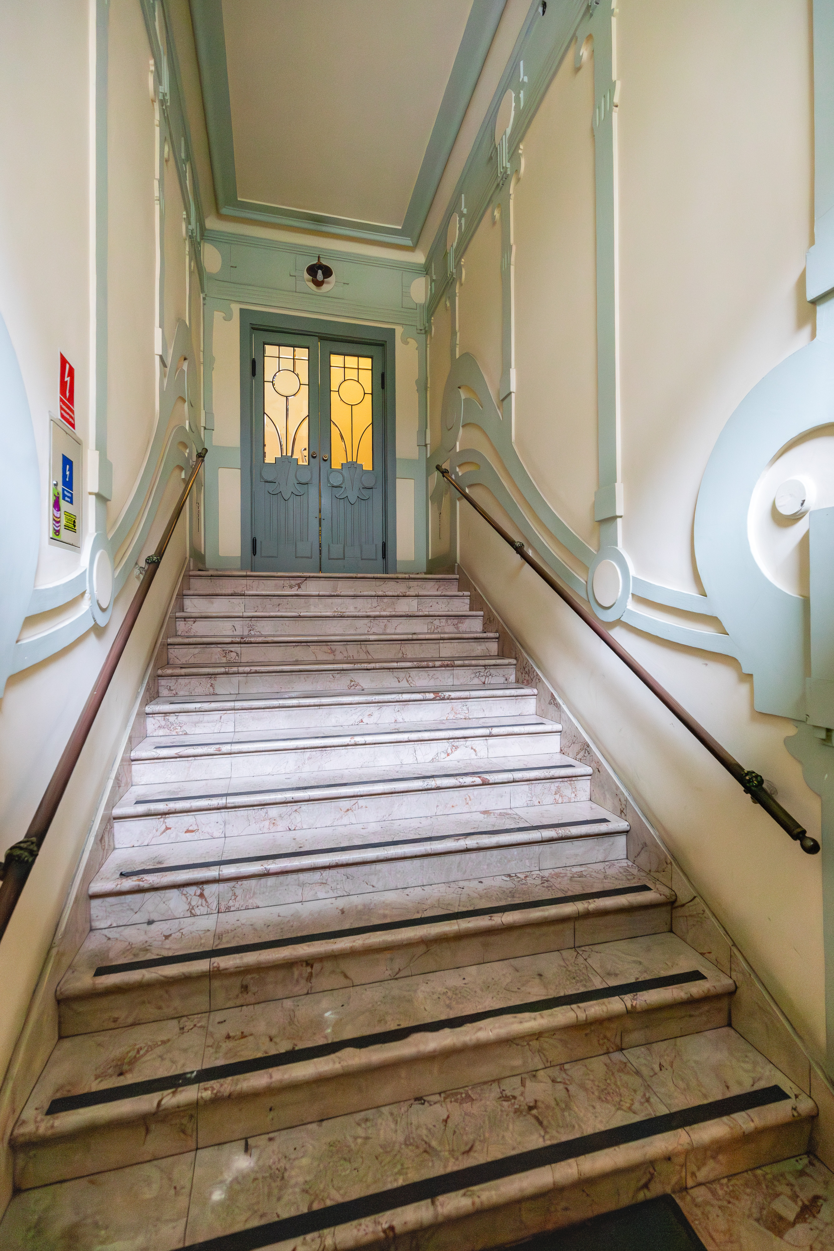 Budynek zachwyca bogato zdobioną elewacją oraz unikatowymi detalami wewnątrz, takimi jak piękne witraże na klatce schodowej z motywami roślinnymi (widoczne na zdjęciach), które są dowodem na rzemieślniczy kunszt dawnych mistrzów.