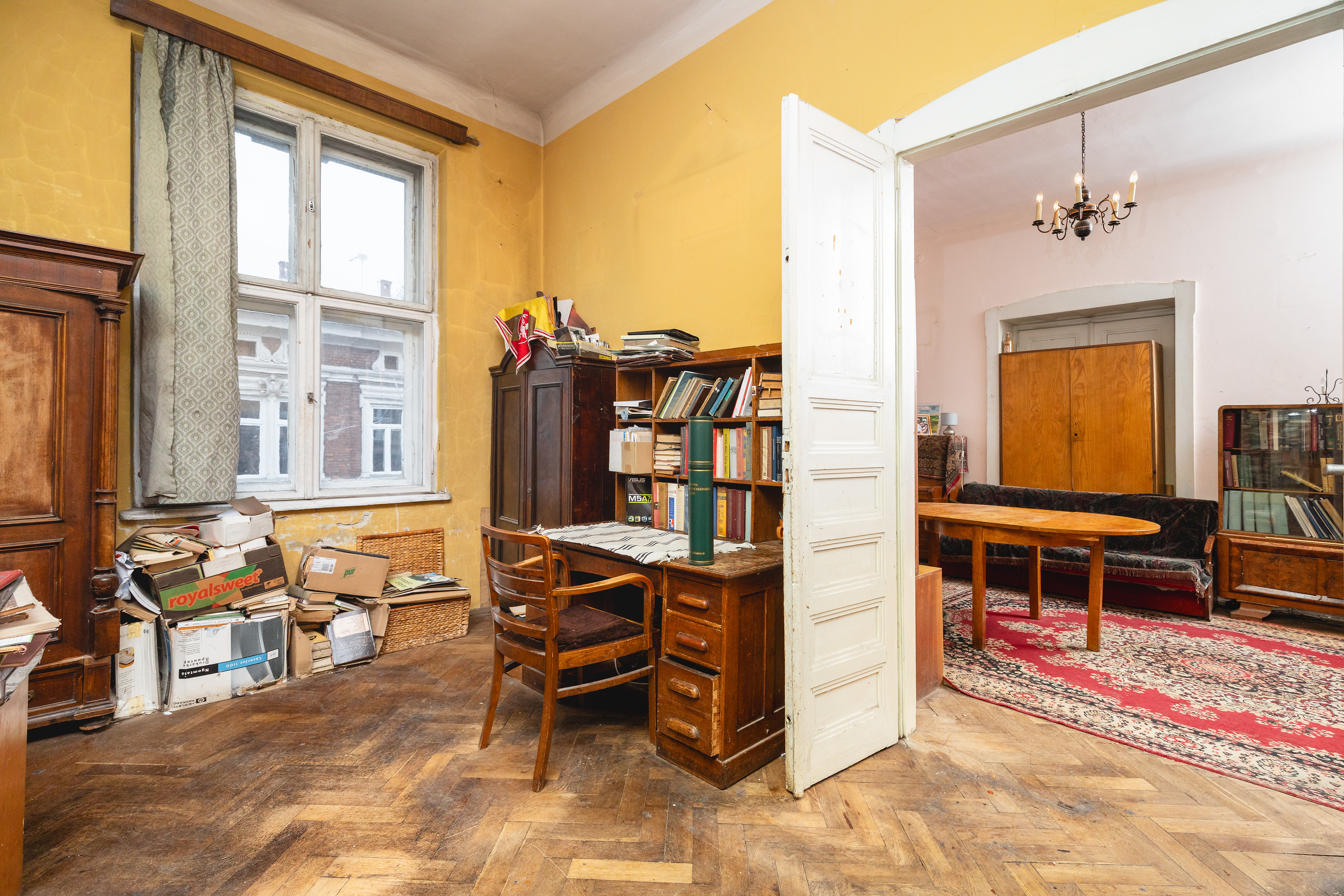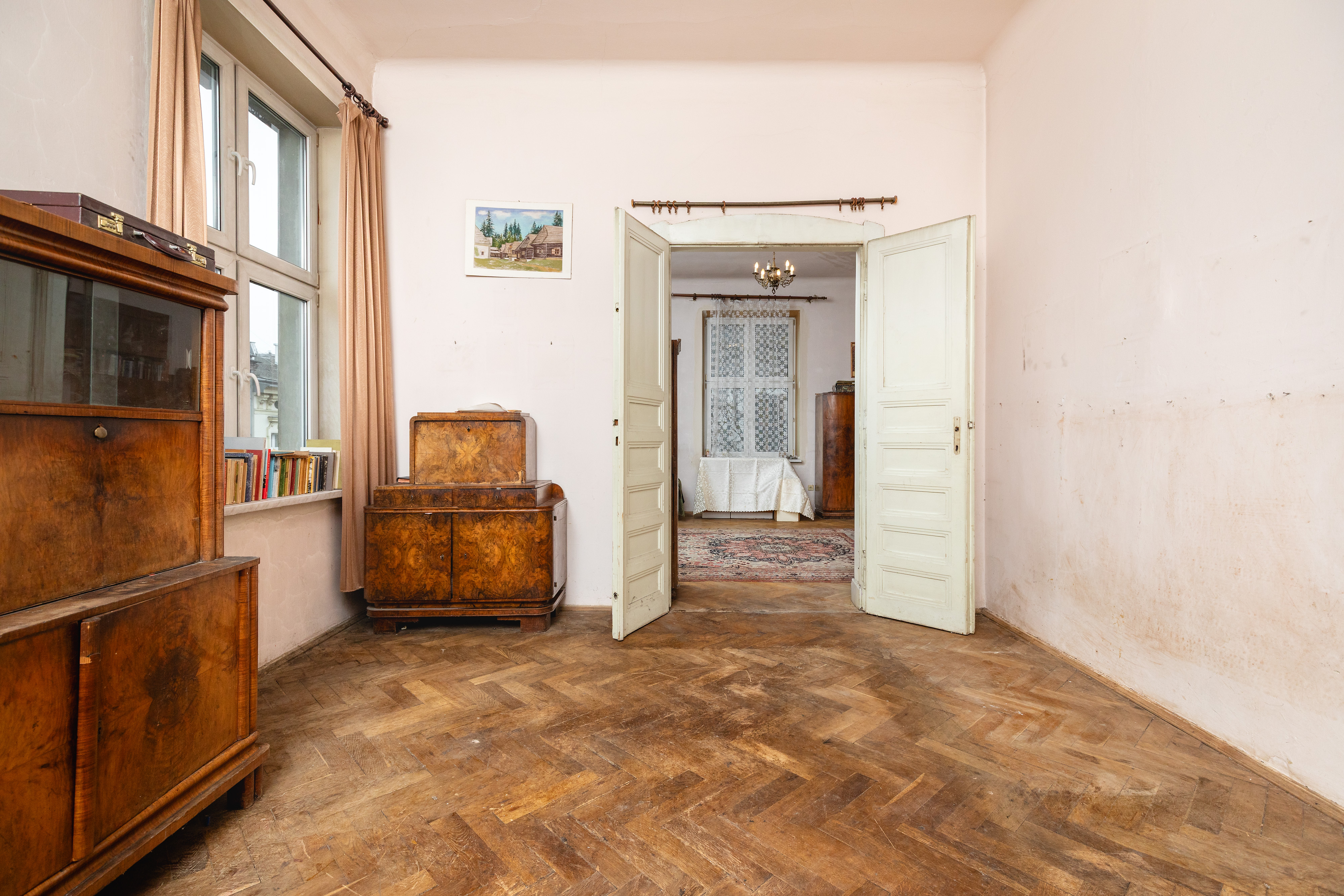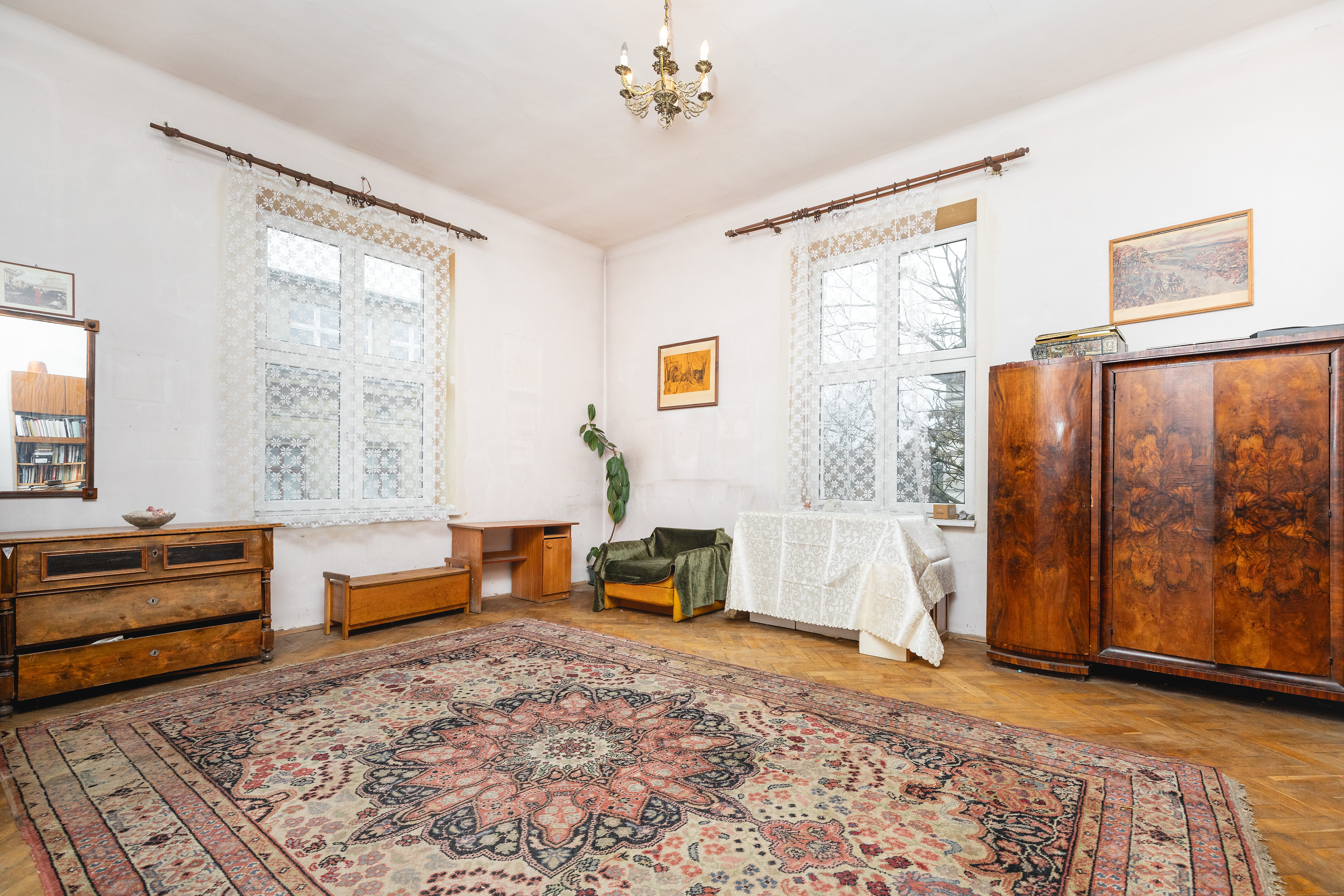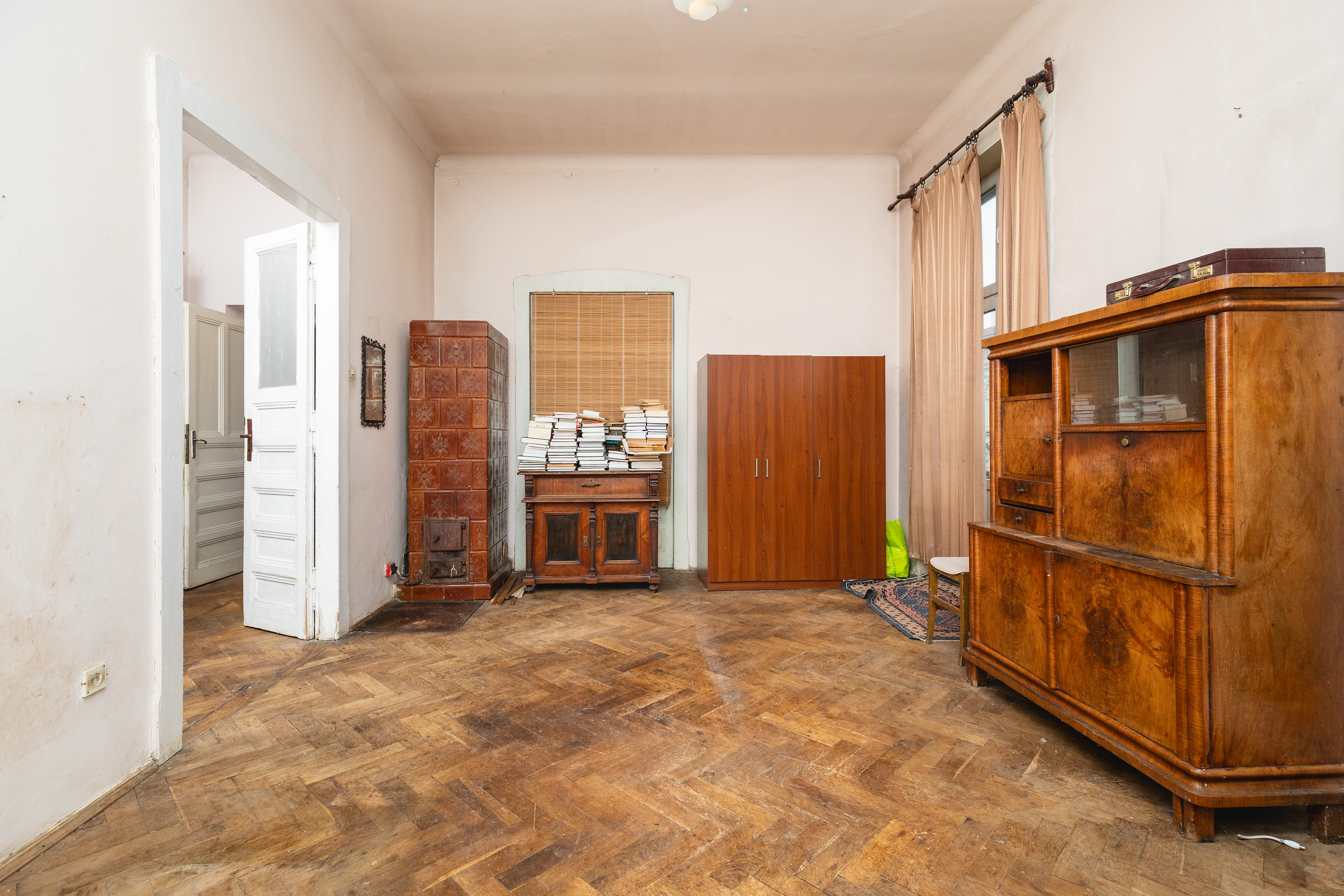 Stan techniczny: Mieszkanie jest w stanie do remontu, co pozwala na pełną personalizację wnętrz z zachowaniem historycznych detali, takich jak oryginalny parkiet ułożony w jodełkę oraz stolarka drzwiowa drewniana
