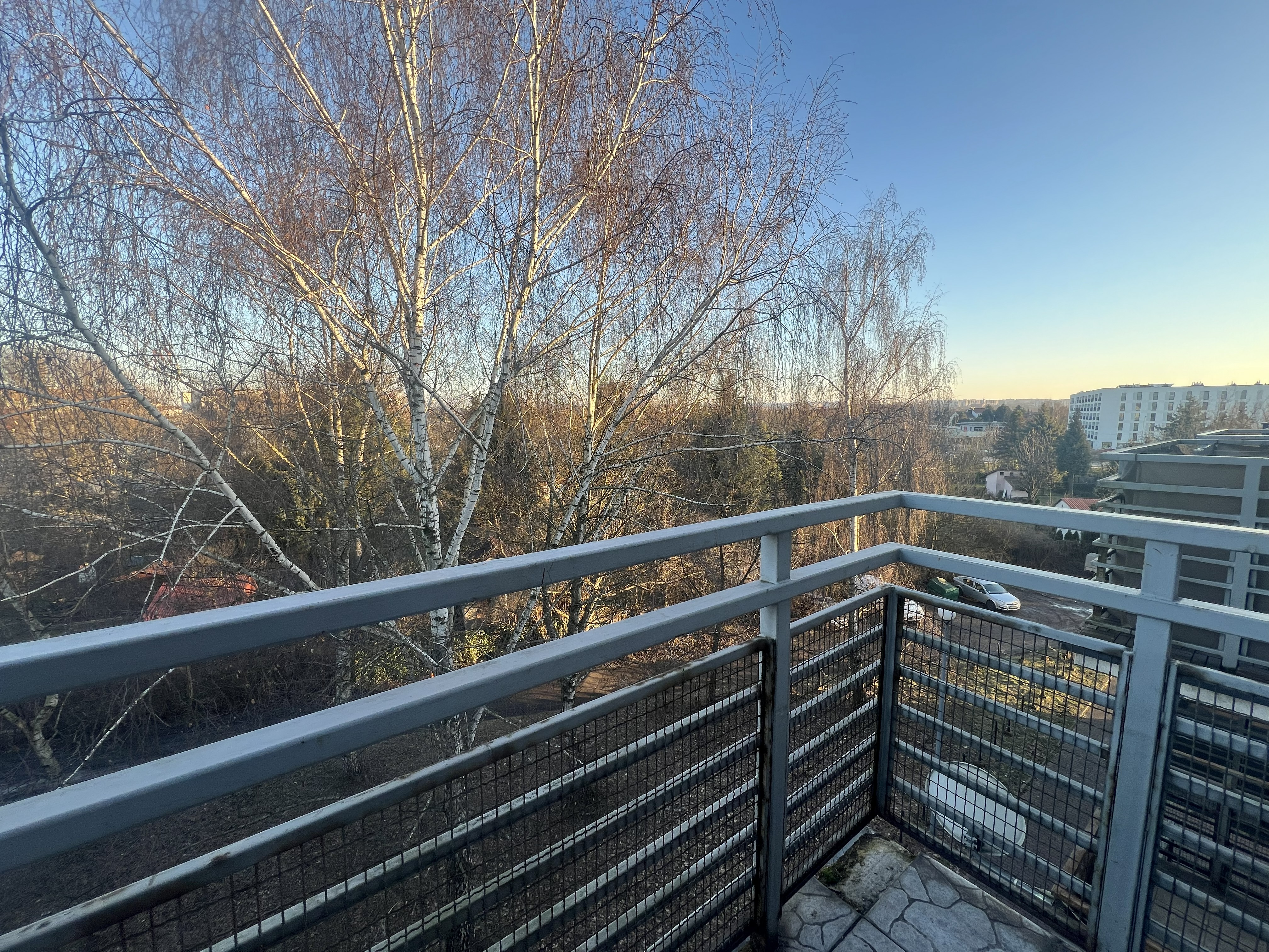 balkon z widokiem na zieleń.