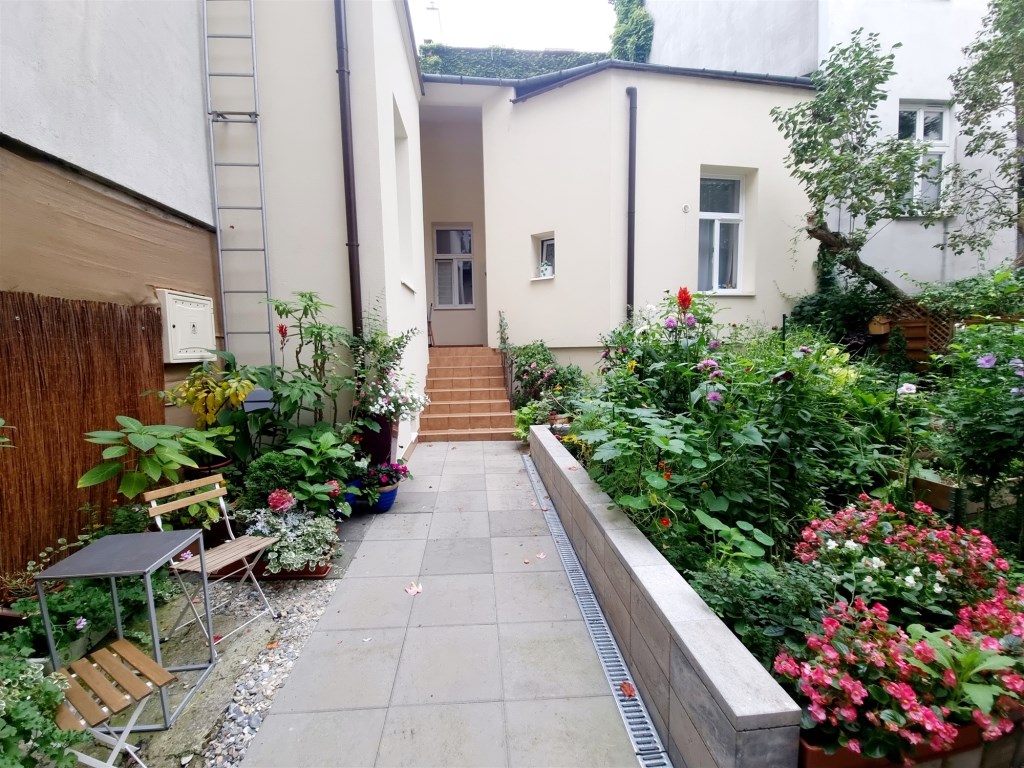Nieruchomość położona w kamienicy od strony pięknego podwórka z ogrodem. Mieści się wysokim parterze.